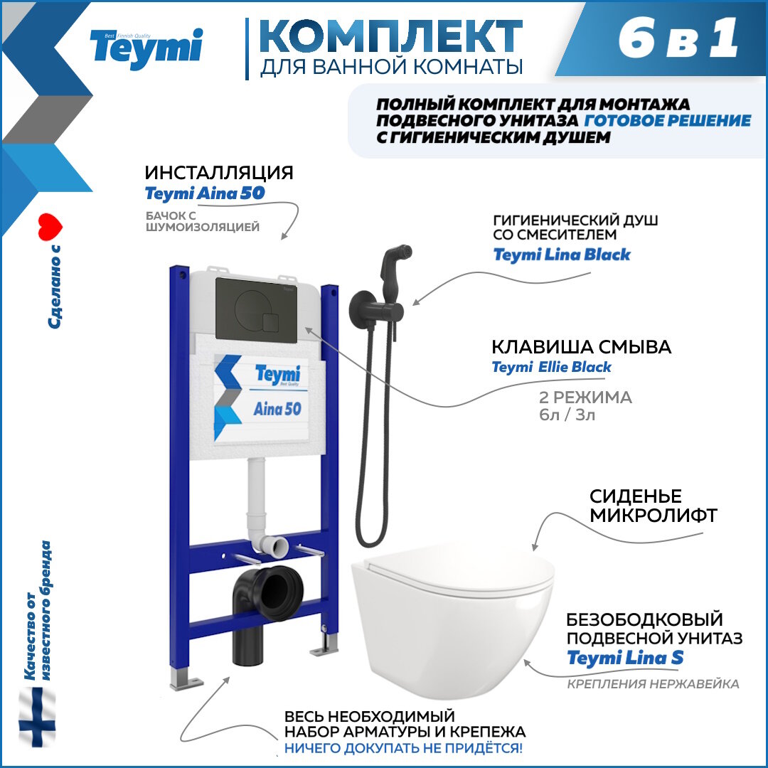 Инсталляция с унитазом комплект 6 в 1 Teymi унитаз подвесной безободковый Lina S кнопка черная гигиенический душ черный F08281