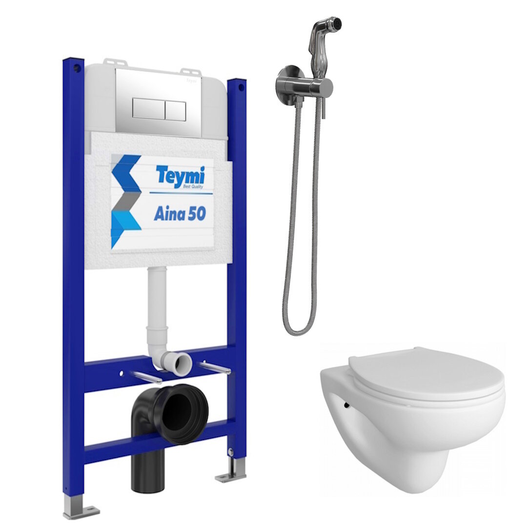 Инсталляция с унитазом комплект 6 в 1 Teymi унитаз подвесной безободковый Hanna Pro кнопка белая гигиенический душ хром F08382