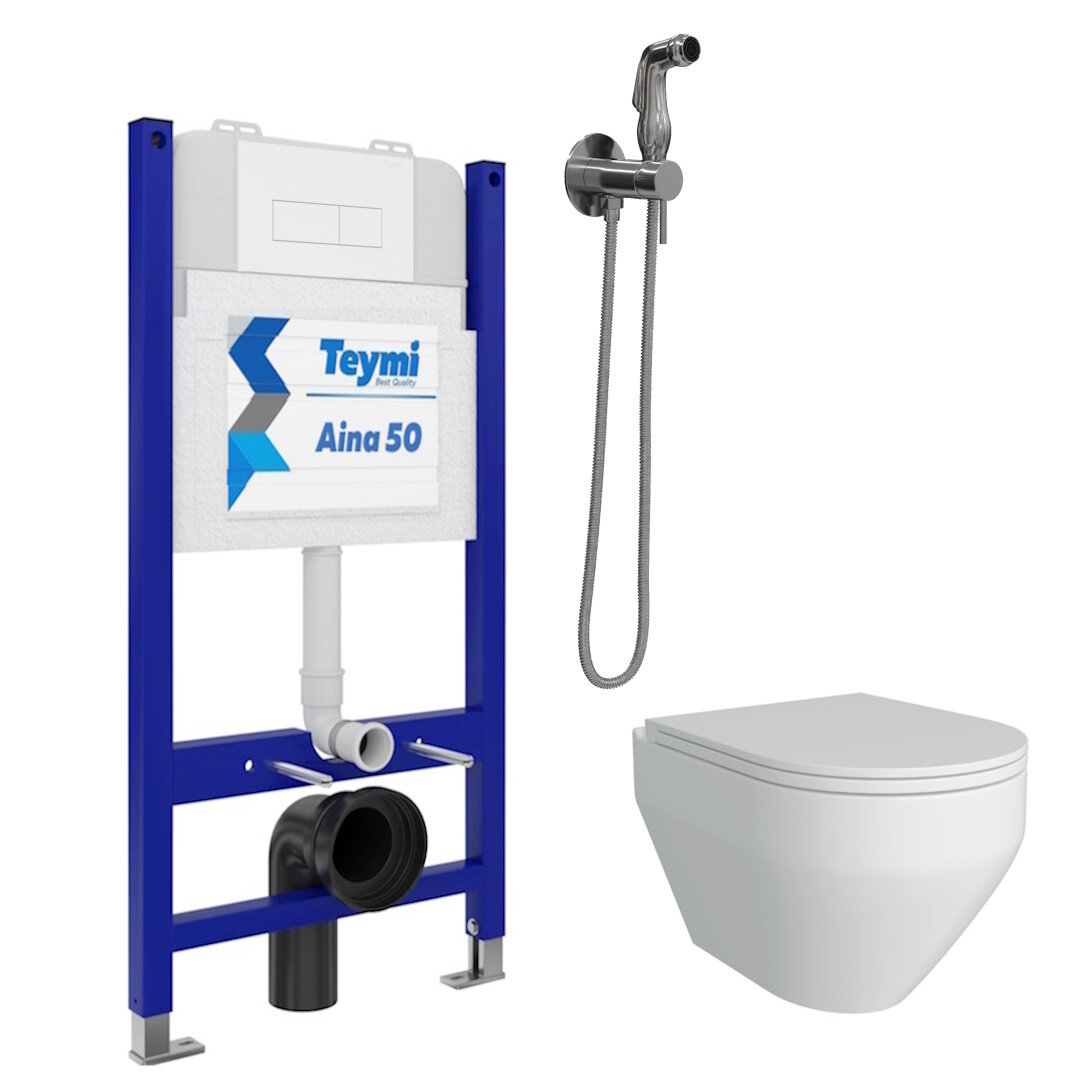 Инсталляция с унитазом комплект 6 в 1 Teymi унитаз подвесной безободковый Demi кнопка хром гигиенический душ хром F08436