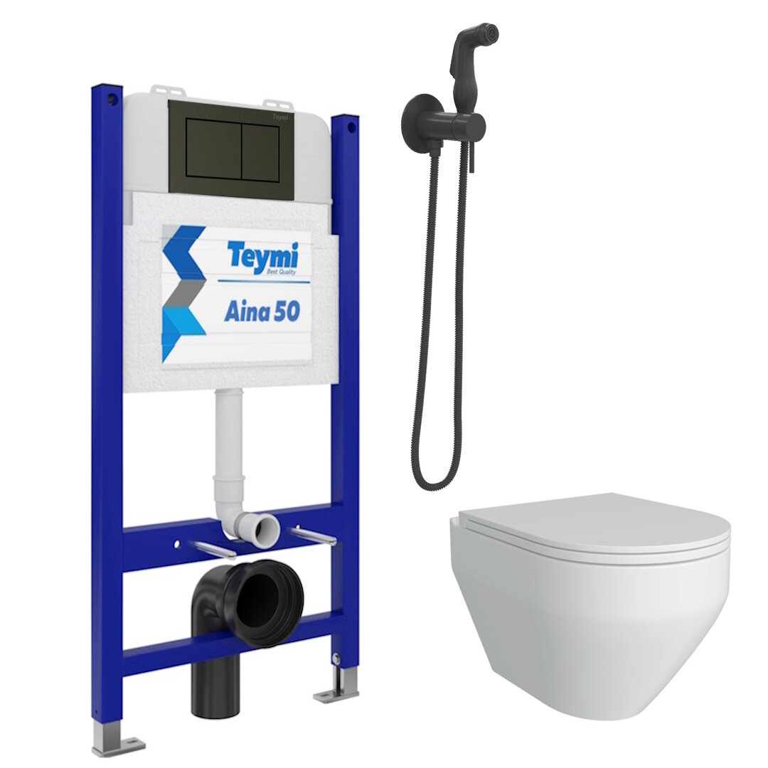 Инсталляция с унитазом комплект 6 в 1 Teymi унитаз подвесной безободковый Demi кнопка черная гигиенический душ черный F08446