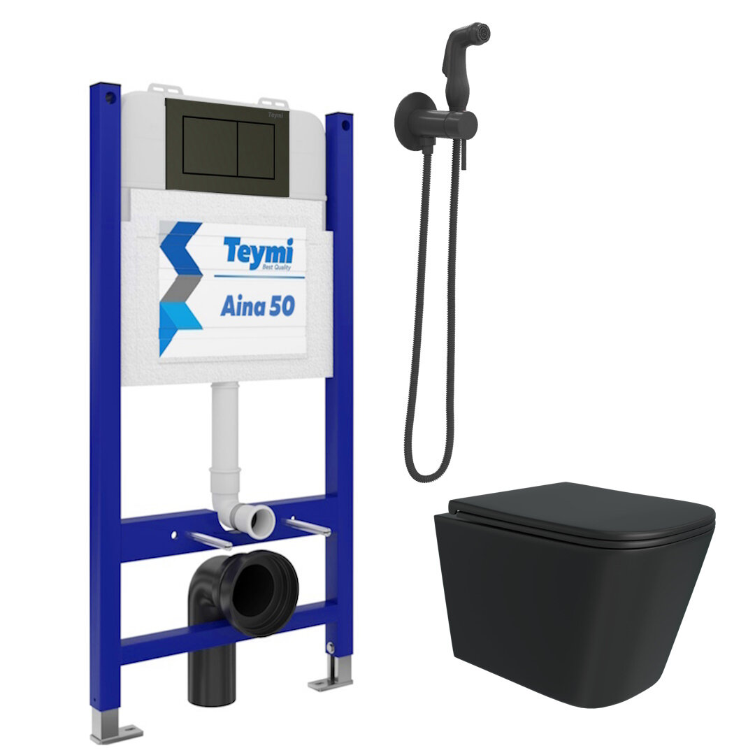 Инсталляция с унитазом комплект 6 в 1 Teymi унитаз подвесной безободковый черный Helmi Black кнопка черная гигиенический душ черный F08404