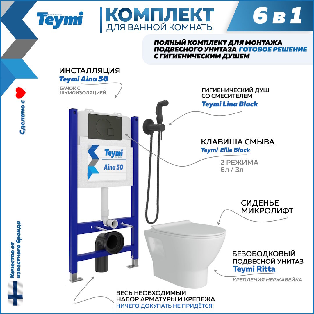 Инсталляция с унитазом комплект 6 в 1 Teymi унитаз подвесной безободковый Ritta кнопка черная гигиенический душ черный F08475