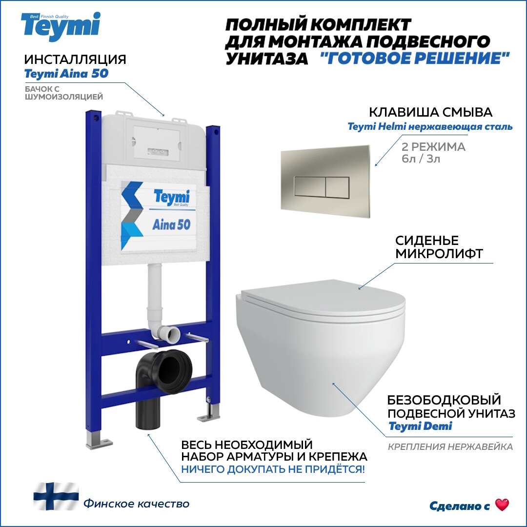 СохранитьИнсталляция с унитазом комплект 5 в 1 Teymi унитаз подвесной безободковый Demi кнопка нержавеющая сталь F13490 интересное: