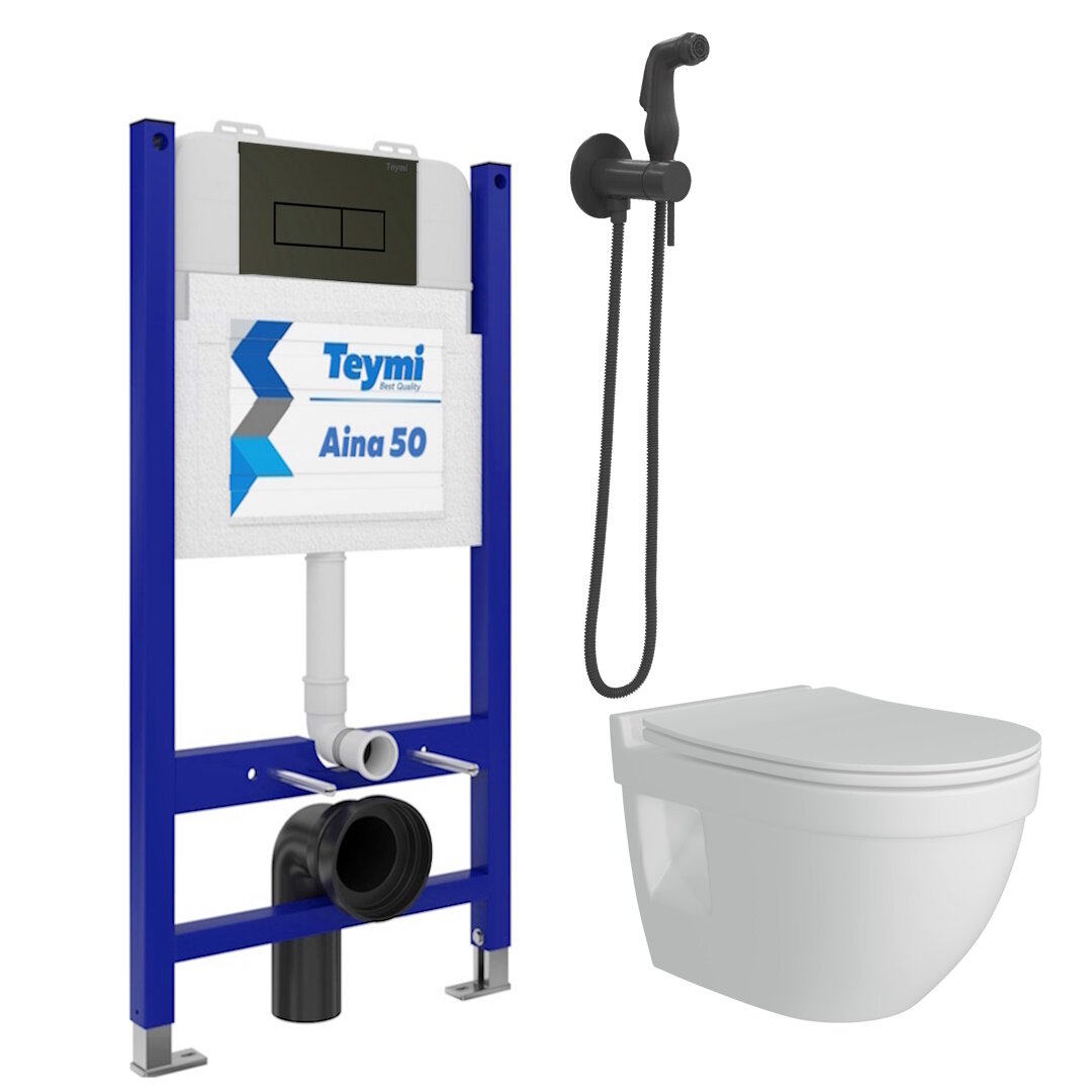 Инсталляция с унитазом комплект 6 в 1 Teymi унитаз подвесной безободковый Vitra Pro кнопка черная гигиенический душ черный F08418