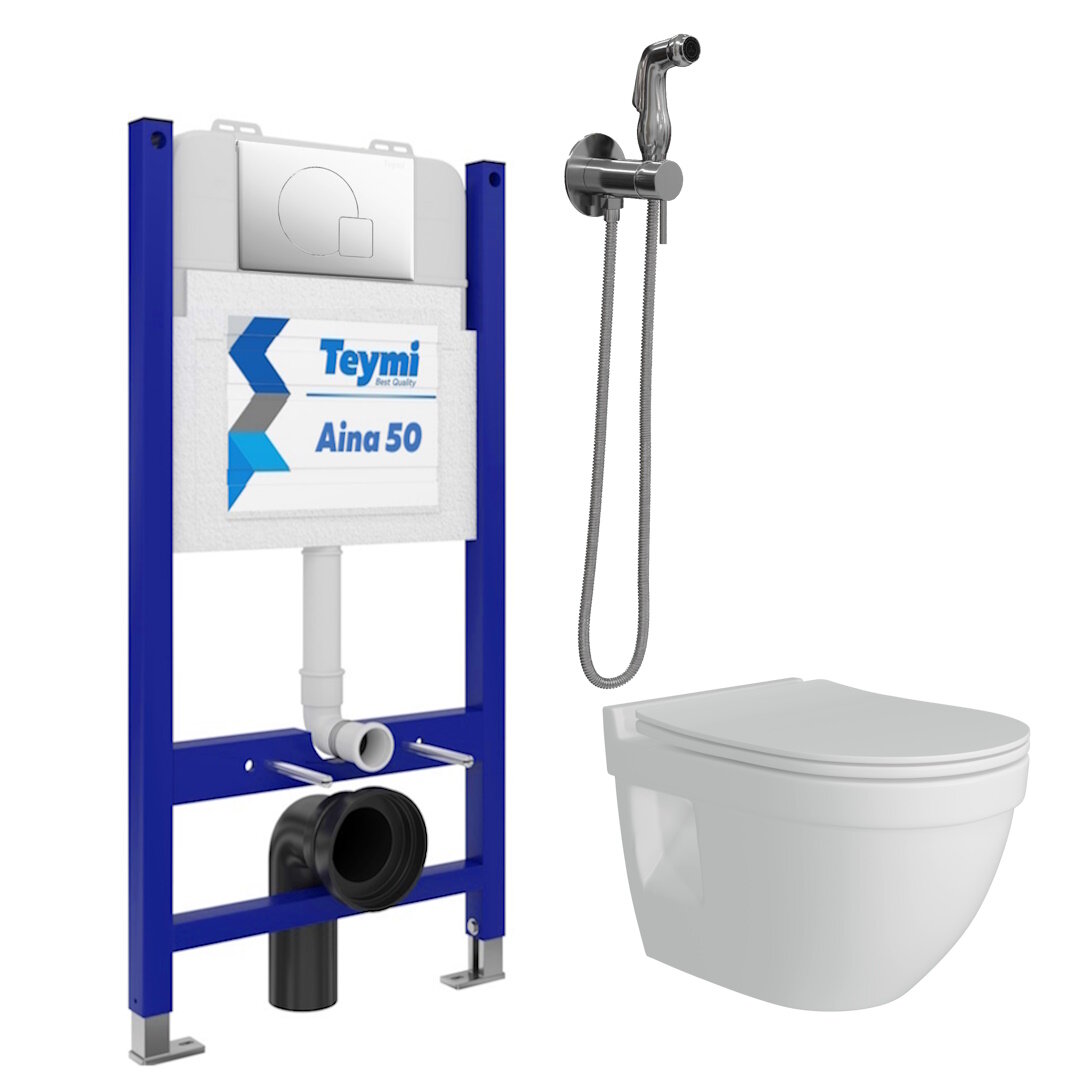 Инсталляция с унитазом комплект 6 в 1 Teymi унитаз подвесной безободковый Vitra Pro кнопка белая гигиенический душ хром F08411