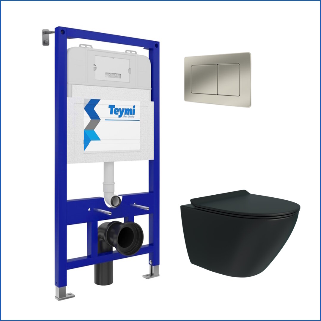 Инсталляция с унитазом комплект 5 в 1 Teymi унитаз подвесной безободковый торнадо черный Lina Pro Vortex Black кнопка нержавеющая сталь F14962