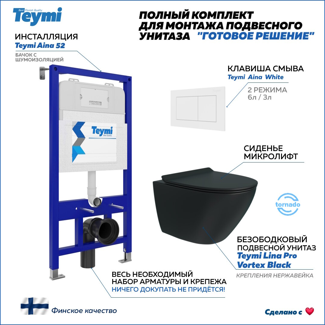 Инсталляция с унитазом комплект 5 в 1 Teymi унитаз подвесной безободковый торнадо черный Lina Pro Vortex Black кнопка белая F14961