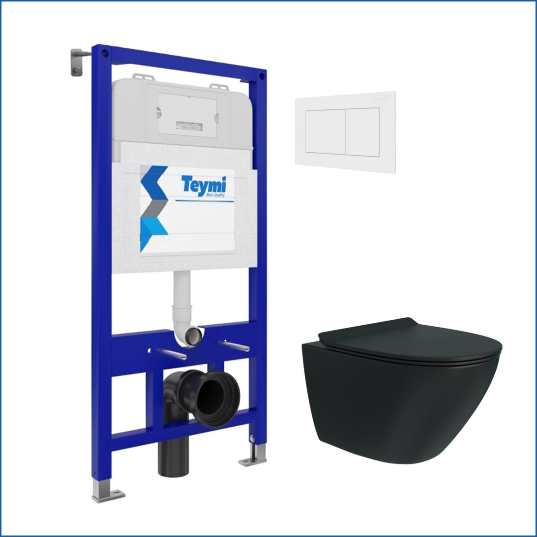Инсталляция с унитазом комплект 5 в 1 Teymi унитаз подвесной безободковый торнадо черный Lina Pro Vortex Black кнопка белая F14977