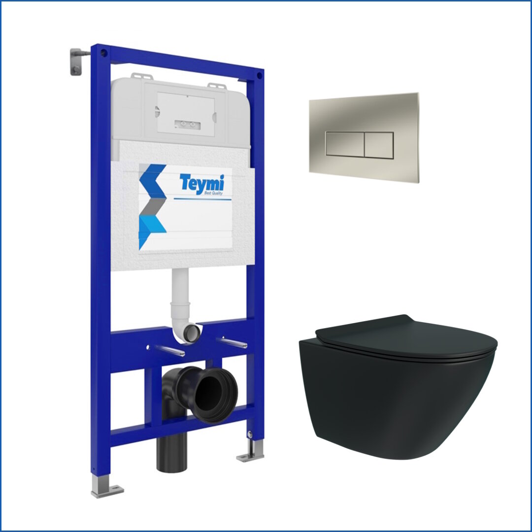 Инсталляция с унитазом комплект 5 в 1 Teymi унитаз подвесной безободковый торнадо черный Lina Pro Vortex Black кнопка нержавеющая сталь F14968