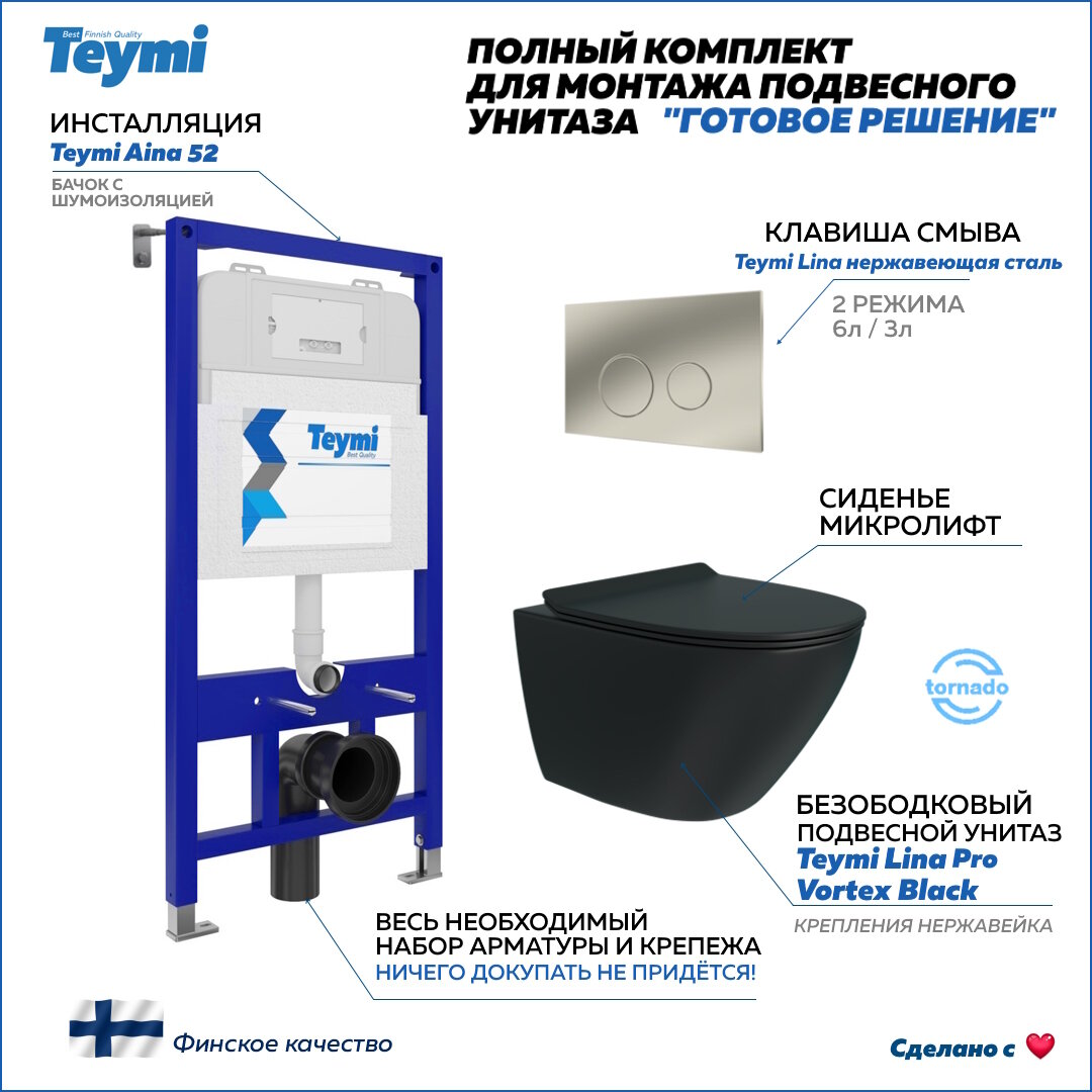 Инсталляция с унитазом комплект 5 в 1 Teymi унитаз подвесной безободковый торнадо черный Lina Pro Vortex Black кнопка нержавеющая сталь F14962