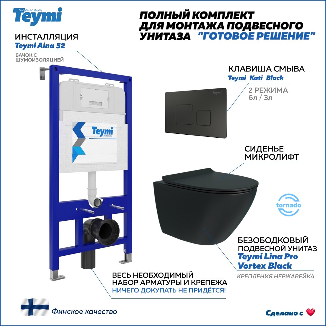 СохранитьИнсталляция с унитазом комплект 5 в 1 Teymi унитаз подвесной безободковый торнадо черный Lina Pro Vortex Black кнопка черная F14976 интересное: