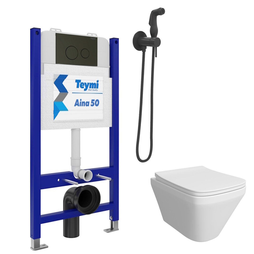 Инсталляция с унитазом комплект 6 в 1 Teymi унитаз подвесной безободковый Kati кнопка черная гигиенический душ черный F08373