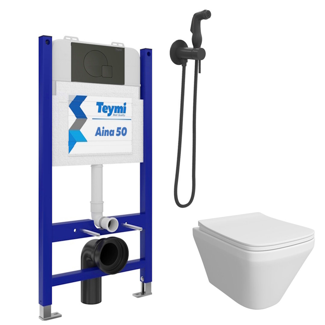 Инсталляция с унитазом комплект 6 в 1 Teymi унитаз подвесной безободковый Kati кнопка черная гигиенический душ черный F08371