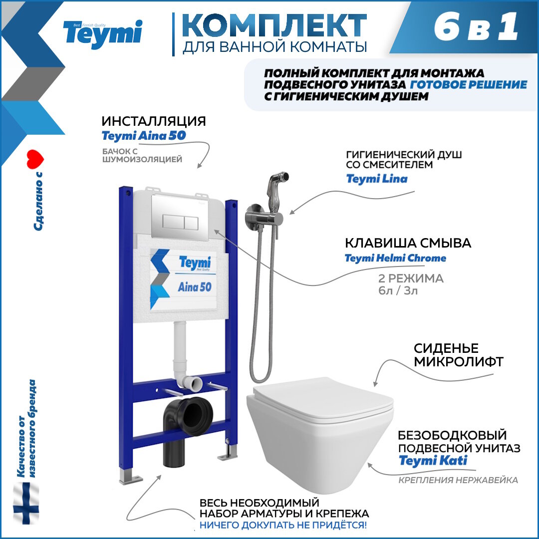 Инсталляция с унитазом комплект 6 в 1 Teymi унитаз подвесной безободковый Kati кнопка хром гигиенический душ хром F08364