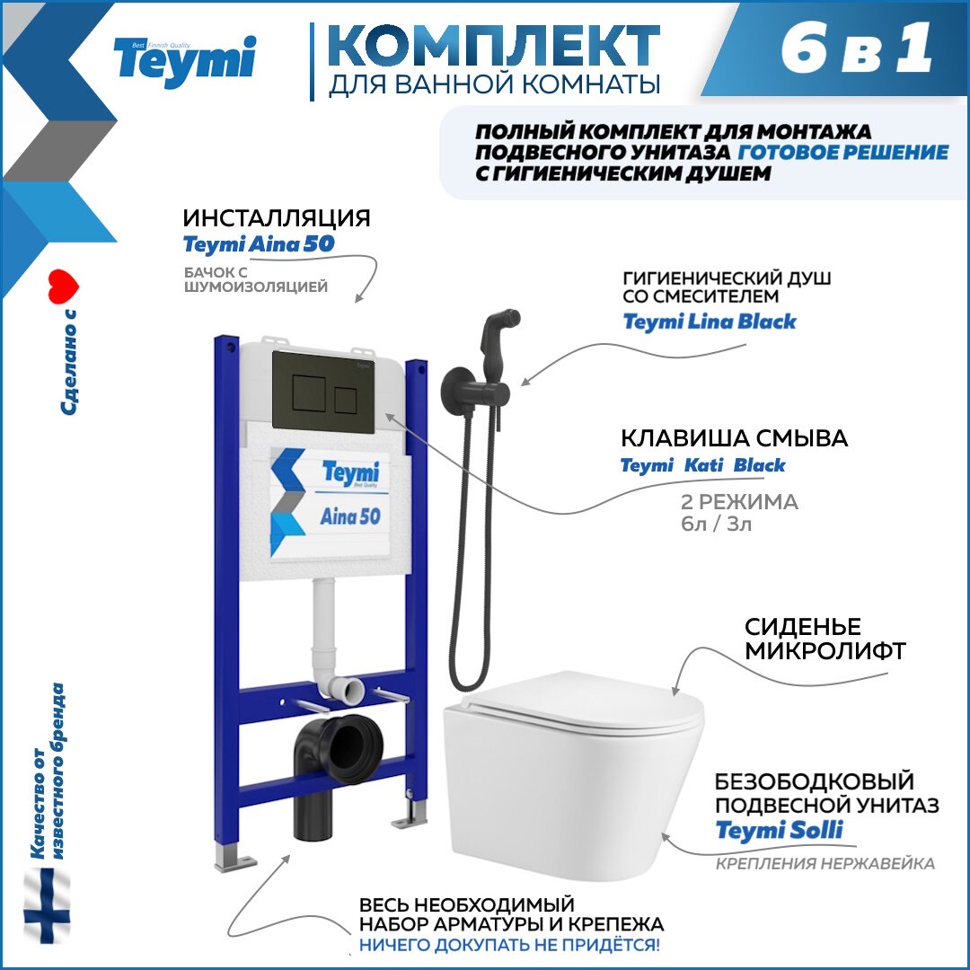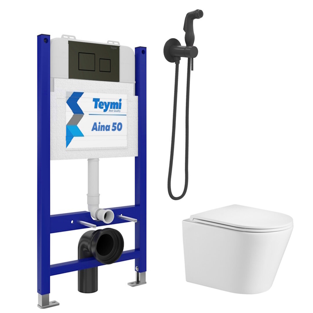 Инсталляция с унитазом комплект 6 в 1 Teymi унитаз подвесной безободковый Solli кнопка черная гигиенический душ черный F08267