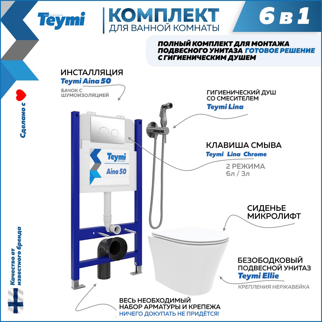 Инсталляция с унитазом комплект 6 в 1 Teymi унитаз подвесной безободковый Ellie кнопка белая гигиенический душ хром F08335
