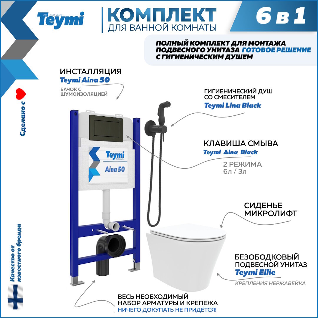 Инсталляция с унитазом комплект 6 в 1 Teymi унитаз подвесной безободковый Ellie кнопка черная гигиенический душ черный F08343