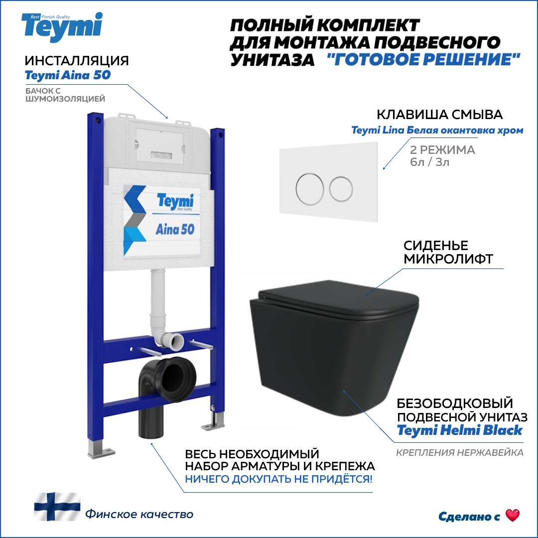СохранитьИнсталляция с унитазом комплект 5 в 1 Teymi унитаз подвесной безободковый черный Helmi Black кнопка белая / хром F13474 интересное:
