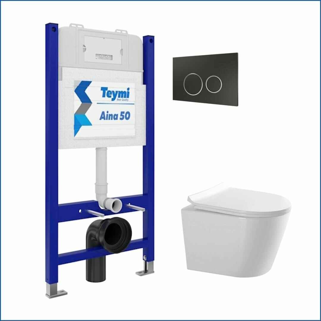 Инсталляция с унитазом комплект 5 в 1 Teymi унитаз подвесной безободковый Solli Pro кнопка нержавеющая сталь F15746