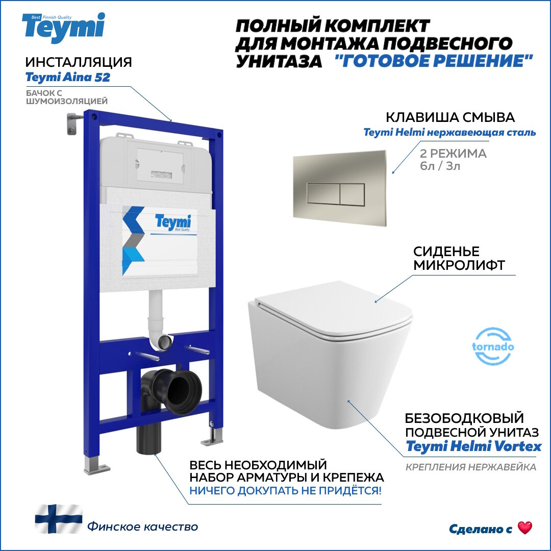 СохранитьИнсталляция с унитазом комплект 5 в 1 Teymi унитаз подвесной безободковый торнадо Helmi Vortex кнопка нержавеющая сталь F13301 интересное: