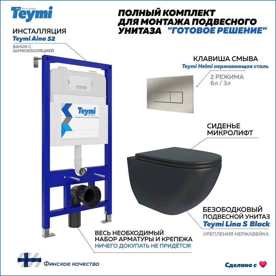 СохранитьИнсталляция с унитазом 5 в 1 Teymi унитаз подвесной безободковый черный Lina S Black кнопка нержавеющая сталь F13392 интересное: