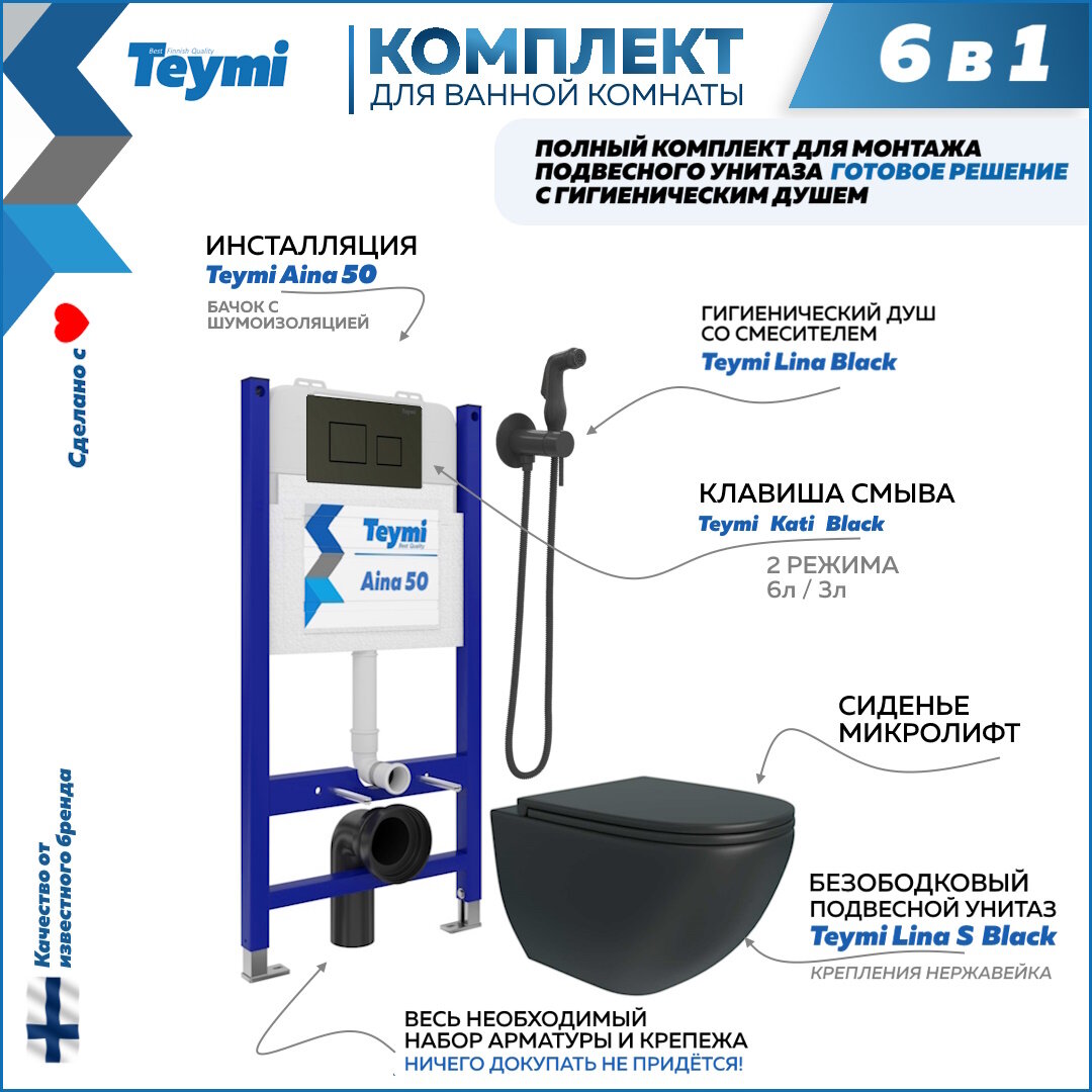 Инсталляция с унитазом комплект 6 в 1 Teymi унитаз подвесной безободковый черный Lina S Black кнопка белая гигиенический душ хром F08504
