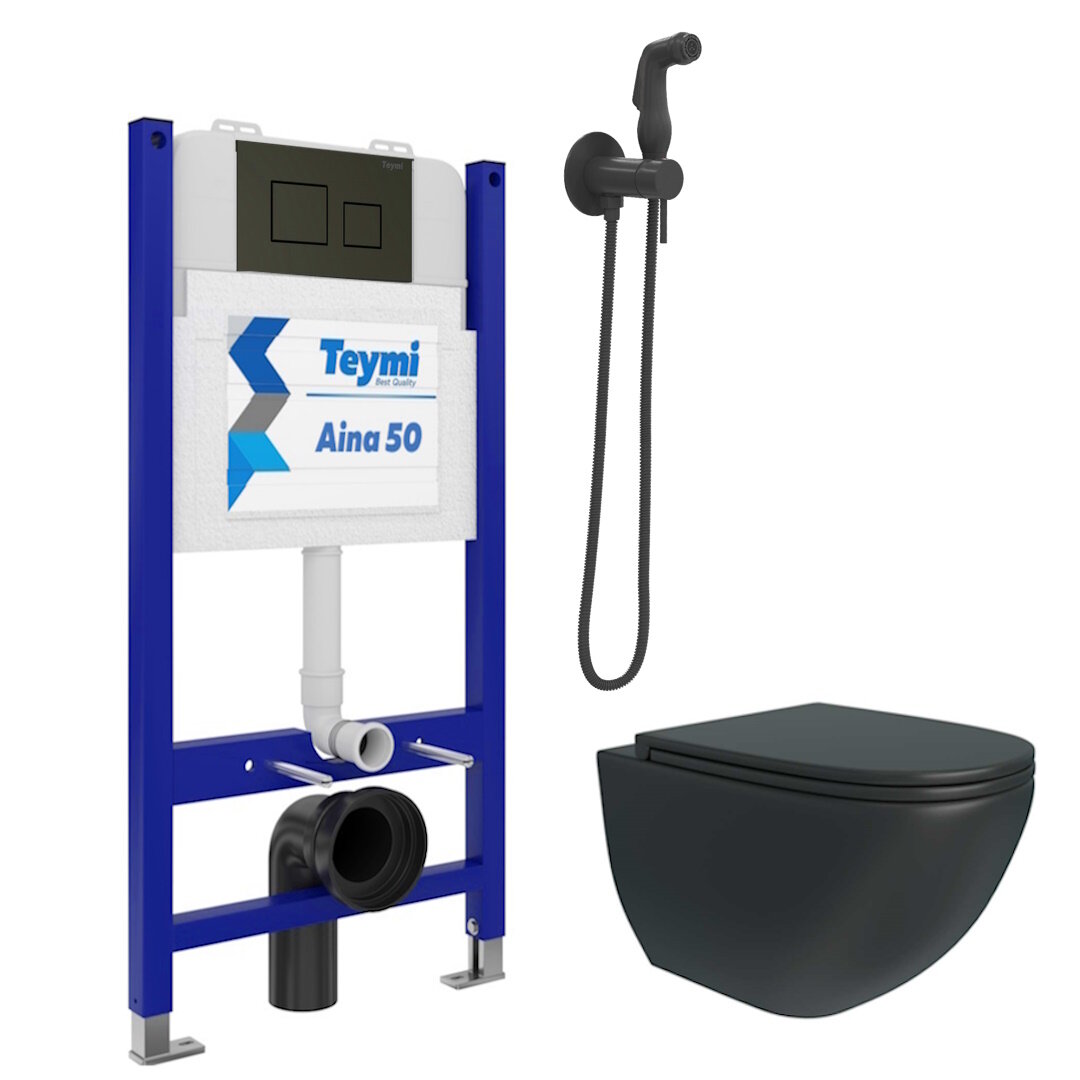 Инсталляция с унитазом комплект 6 в 1 Teymi унитаз подвесной безободковый черный Lina S Black кнопка черная гигиенический душ черный F08507