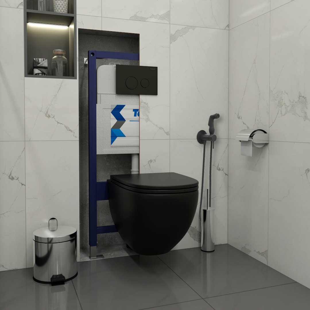 Инсталляция с унитазом комплект 6 в 1 Teymi унитаз подвесной безободковый черный Lina S Black кнопка черная гигиенический душ черный F08508