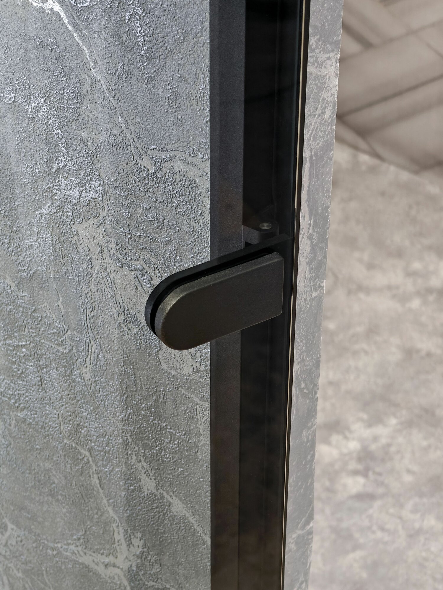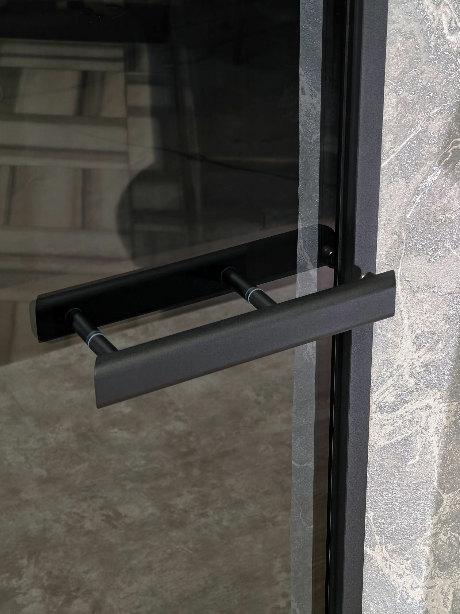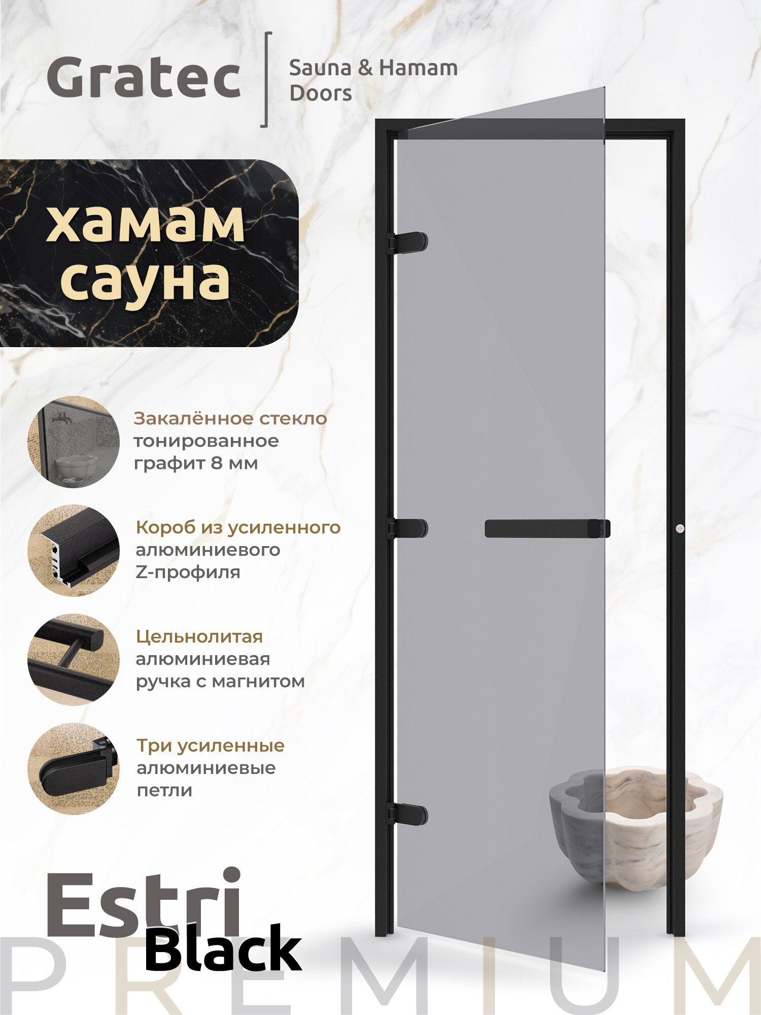 Дверь для хамам и сауны Gratec Estri BK Premium, чёрные короб и фурнитура, серое прозрачное закаленное стекло 8 мм, левое открывание интересное: