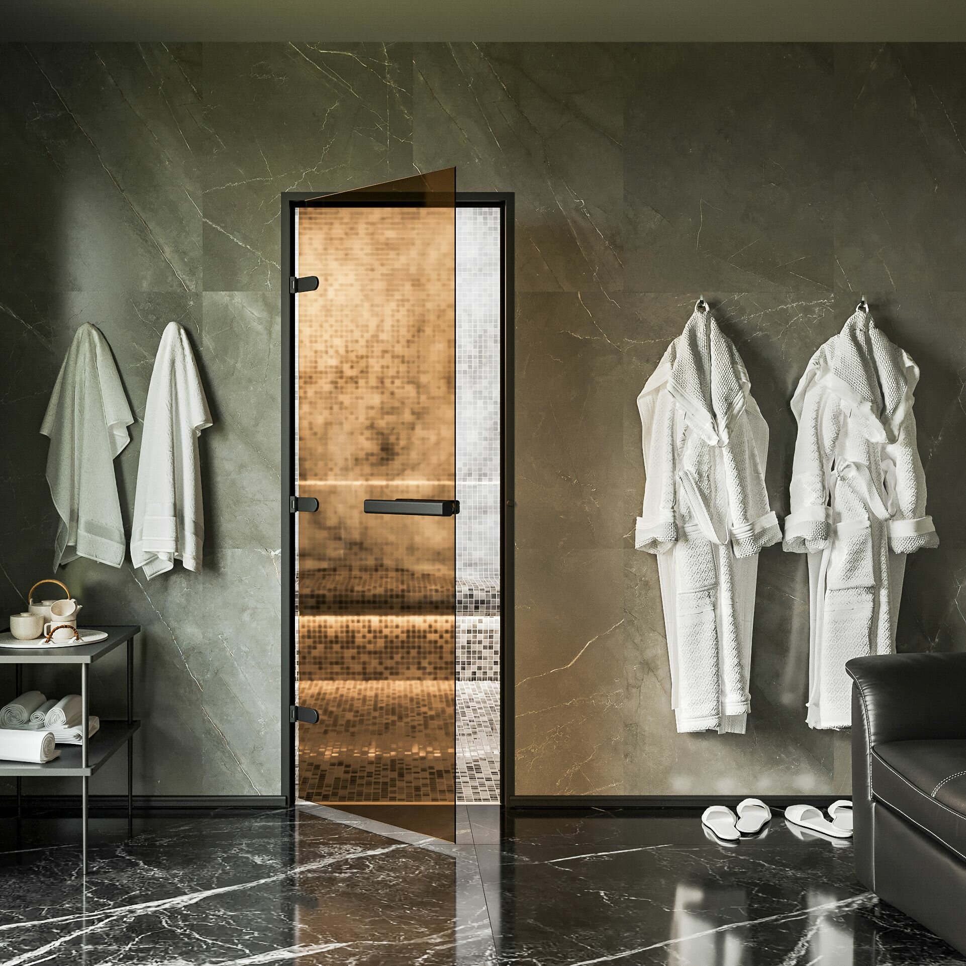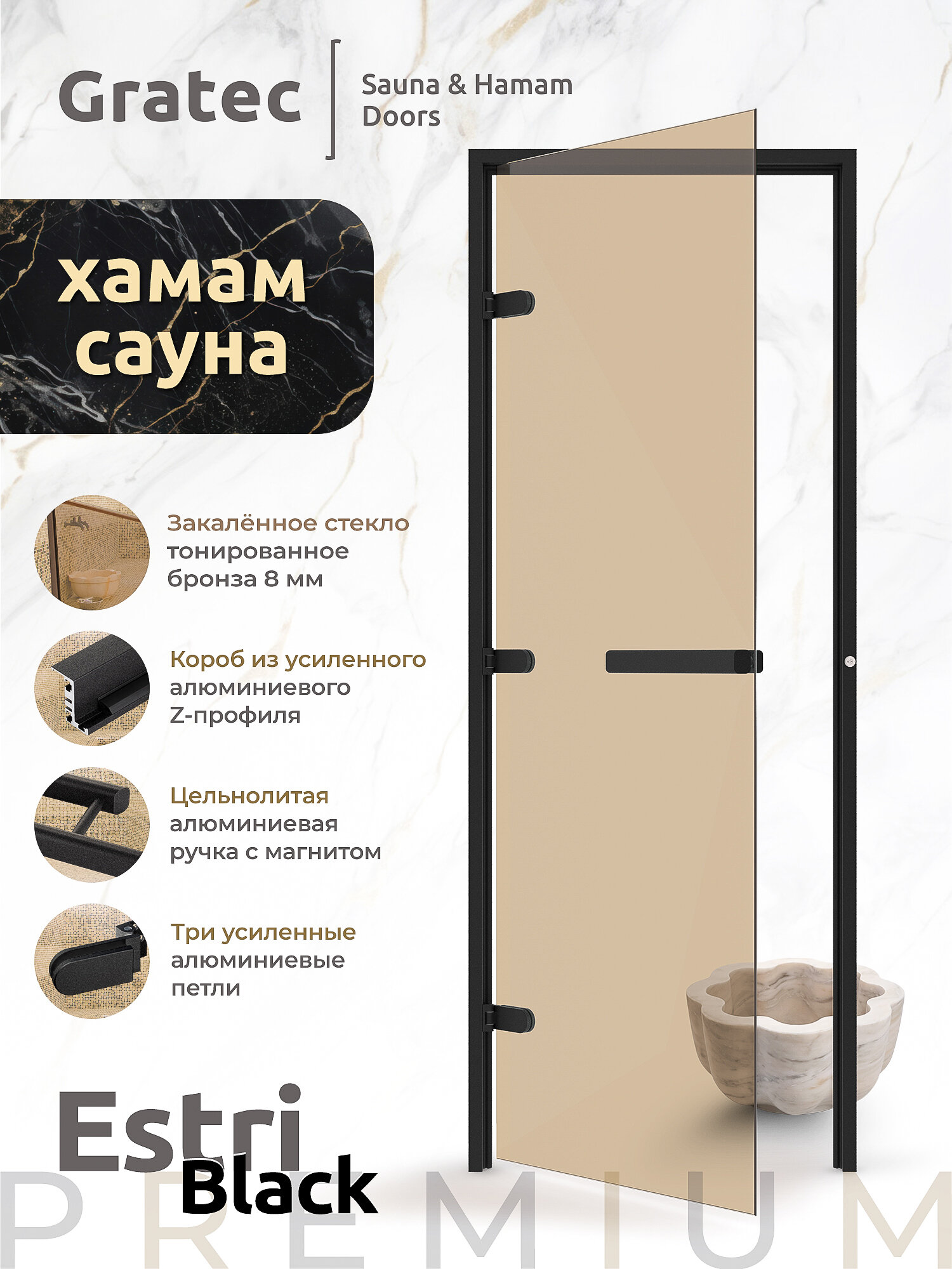 Дверь для хамам и сауны Gratec Estri BK Premium, чёрные короб и фурнитура, бронза прозрачное закаленное стекло 8 мм, левое открывание интересное: