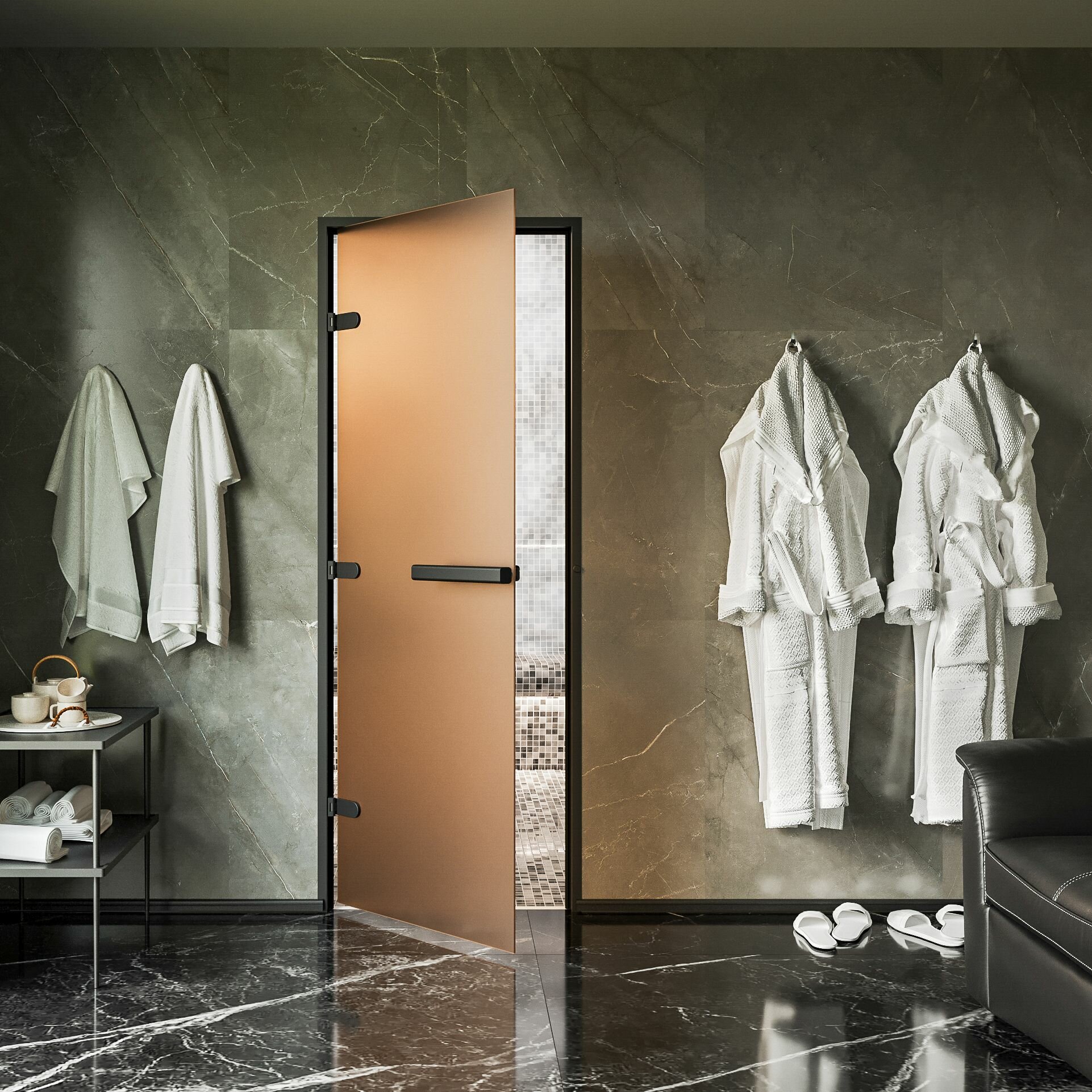 Дверь для хамам и сауны Gratec Estri BK Premium, чёрные короб и фурнитура, бронза матовое закаленное стекло 8 мм, левое открывание интересное: