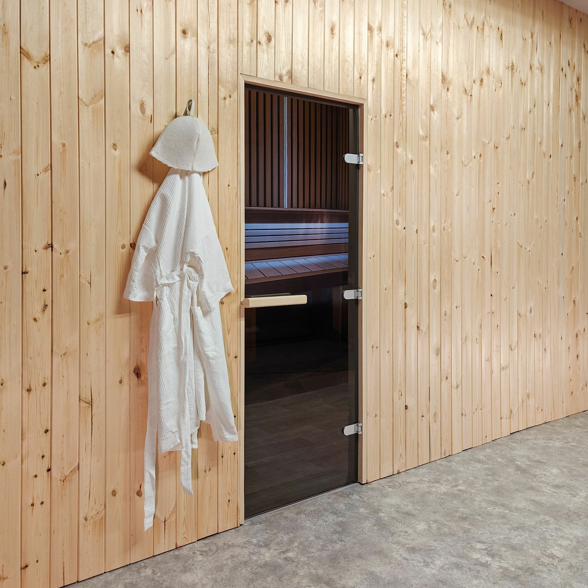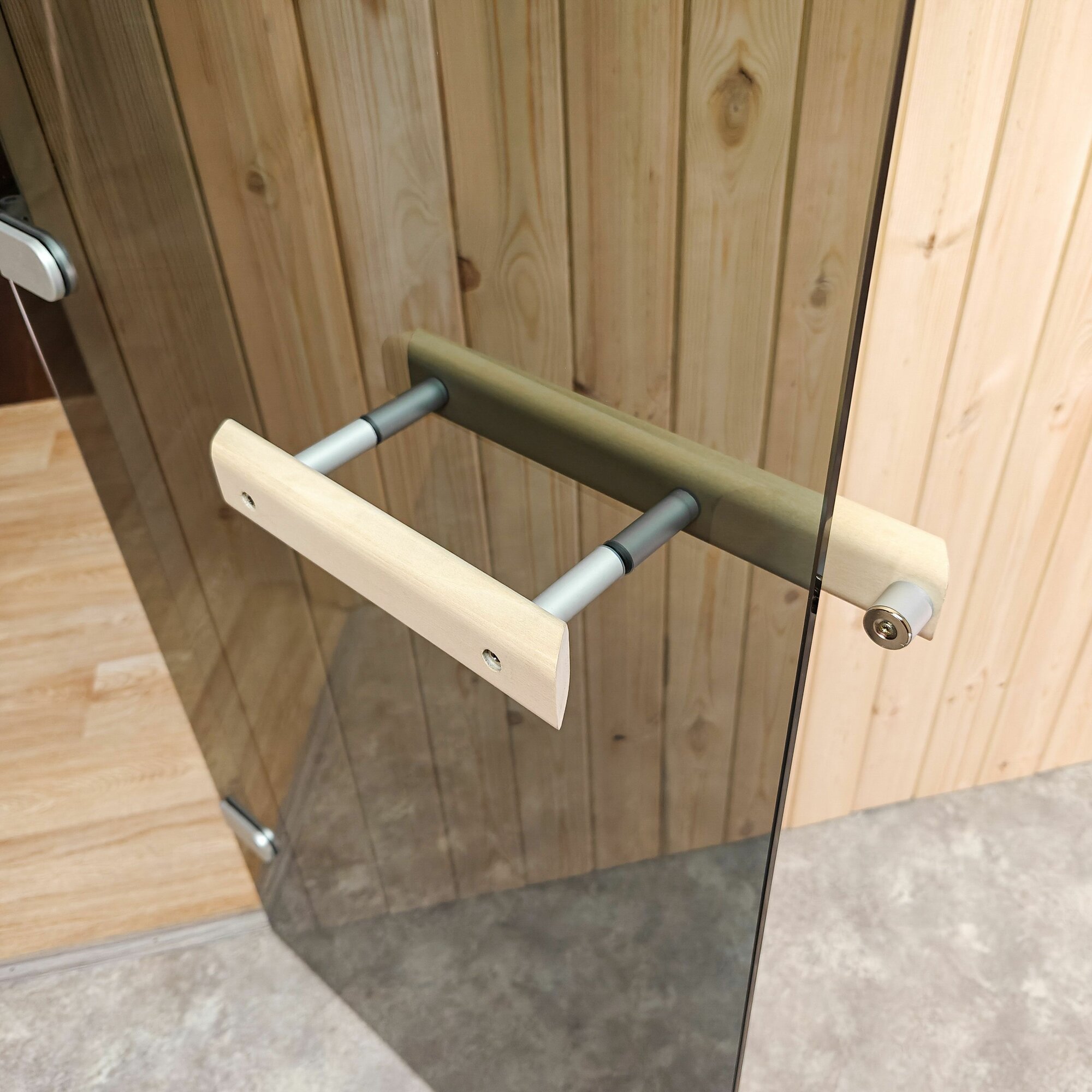 Купить Дверь для бани и сауны Gratec Kati, короб из массива липы, серое прозрачное закаленное стекло 8 мм, правое открывание
