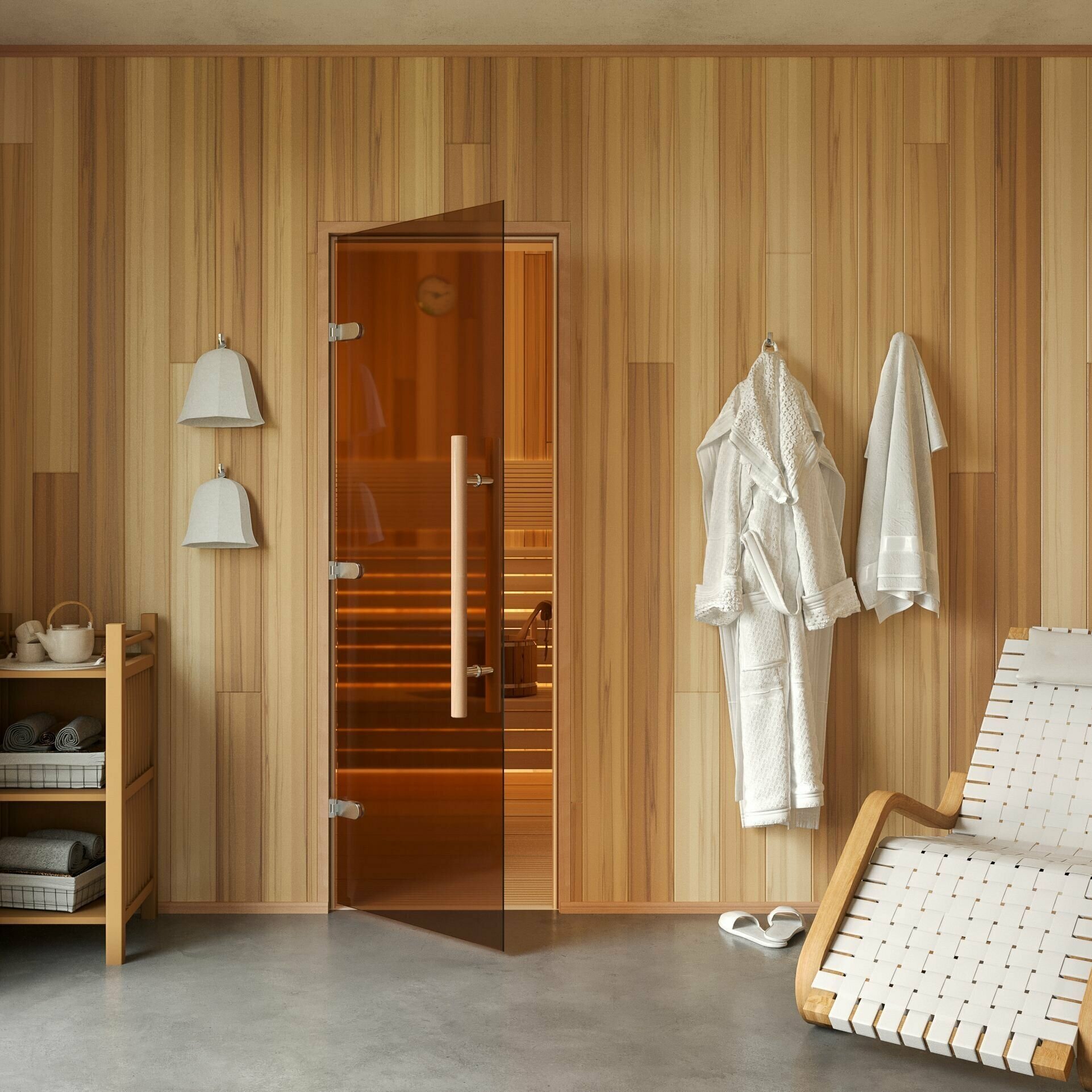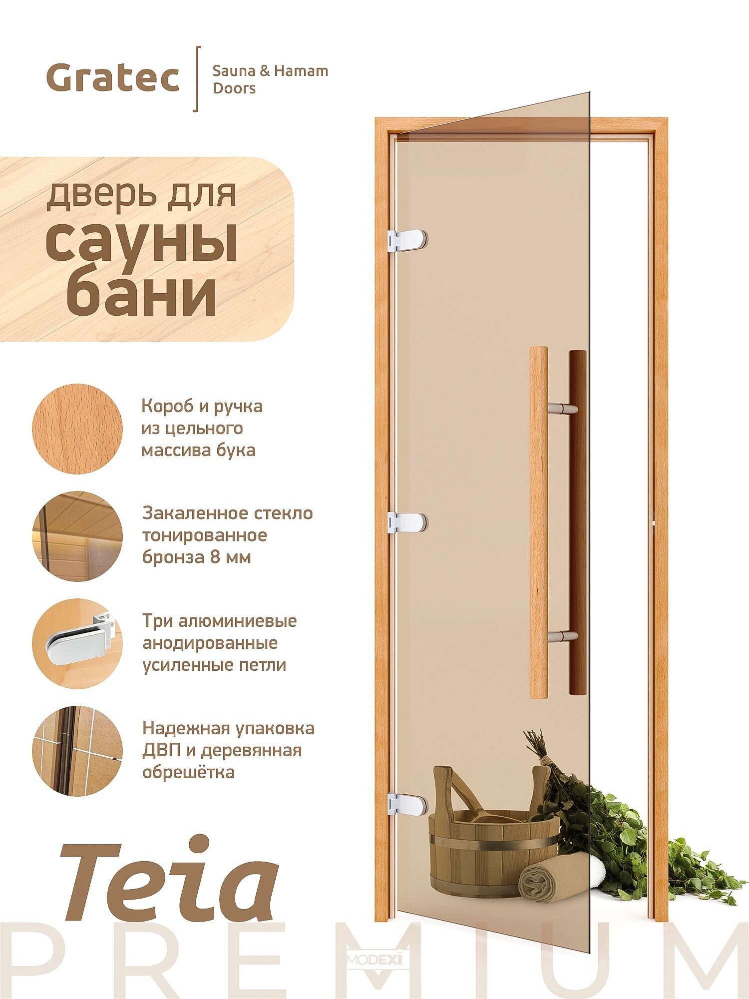 Дверь для бани и сауны Gratec Teia Premium, короб из массива бука, закаленное стекло 8 мм бронза, левое открывание интересное: