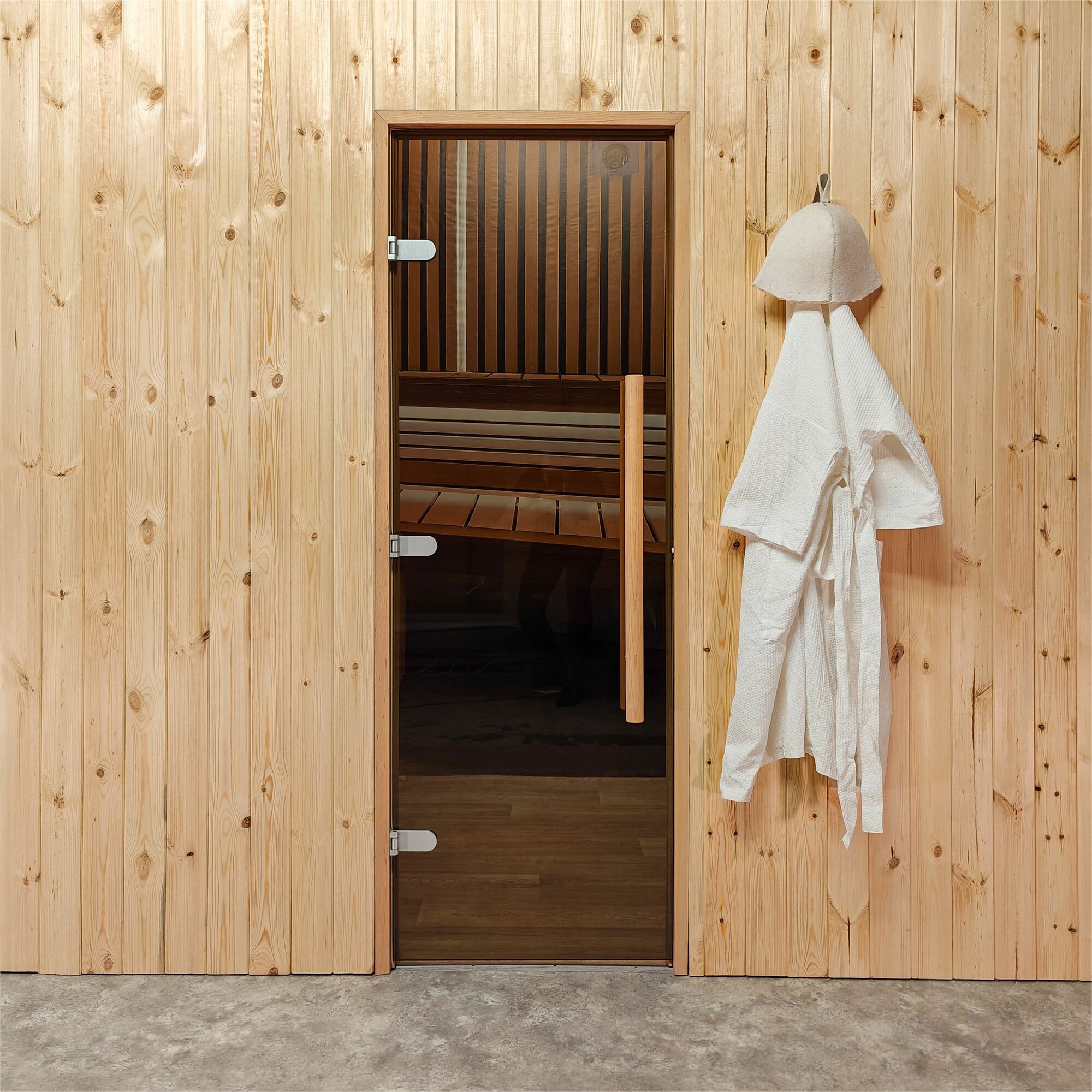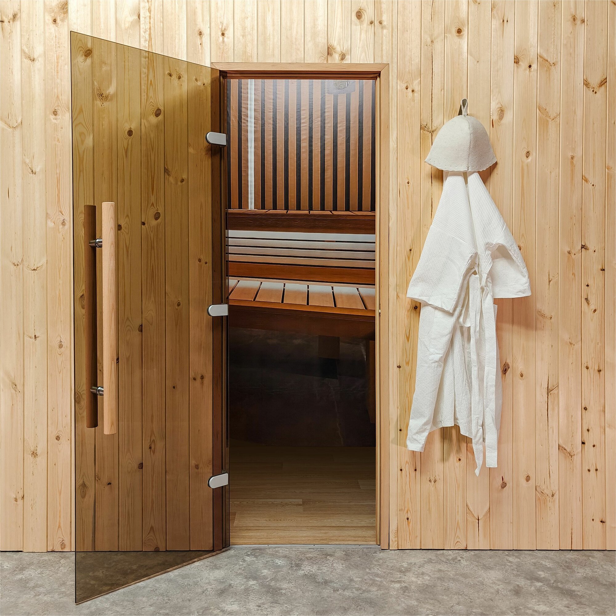 Купить Дверь для бани и сауны Gratec Teia Premium, короб из массива бука, закаленное стекло 8 мм бронза, левое открывание
