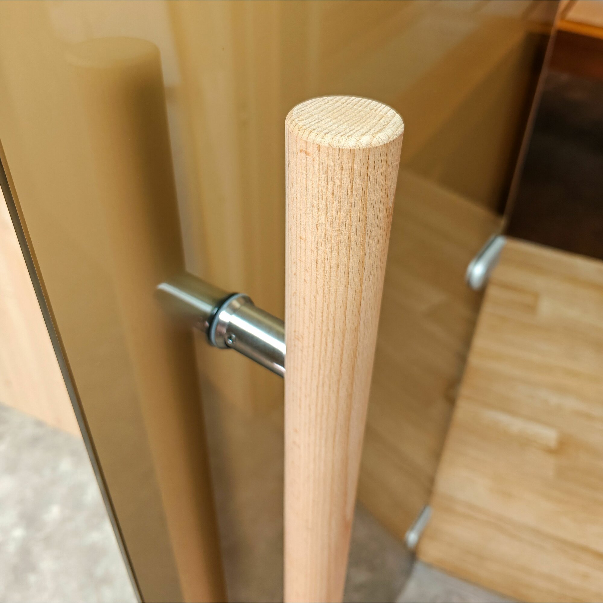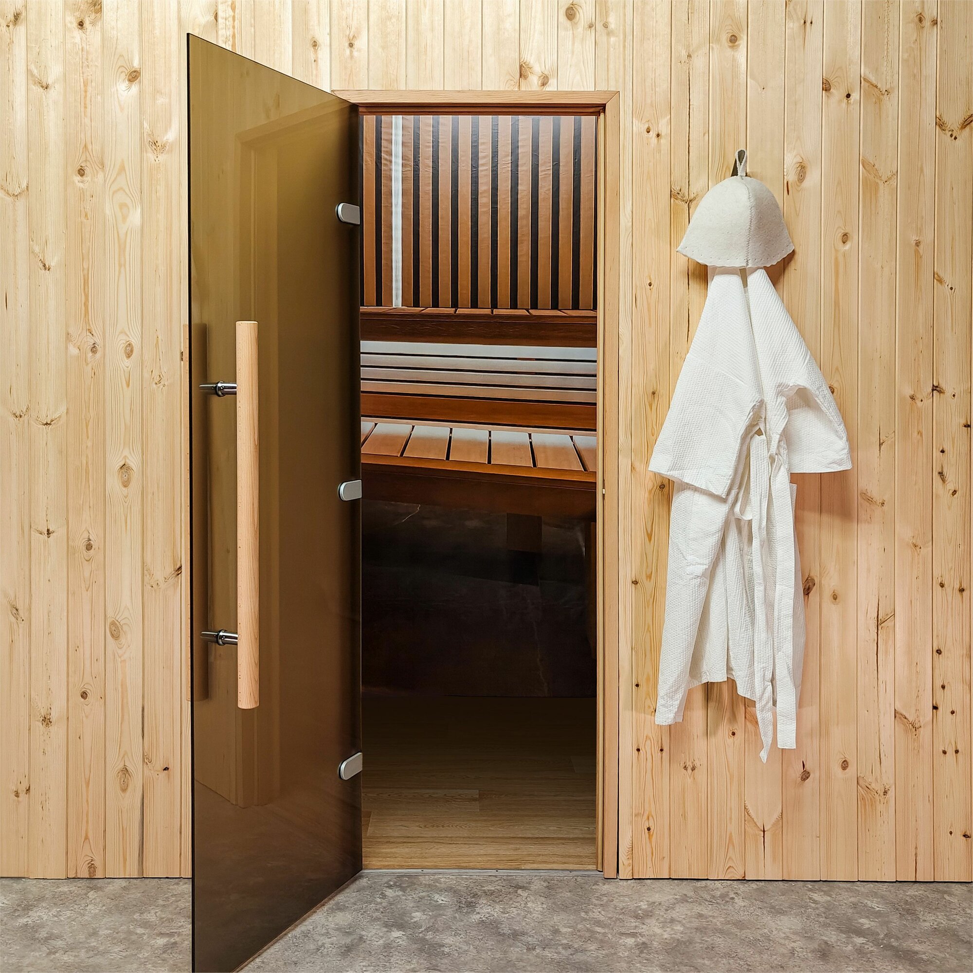 Дверь для бани и сауны Gratec Teia Premium 2025, короб из массива бука, бронза матовое закаленное стекло 8 мм, левое открывание интересное: