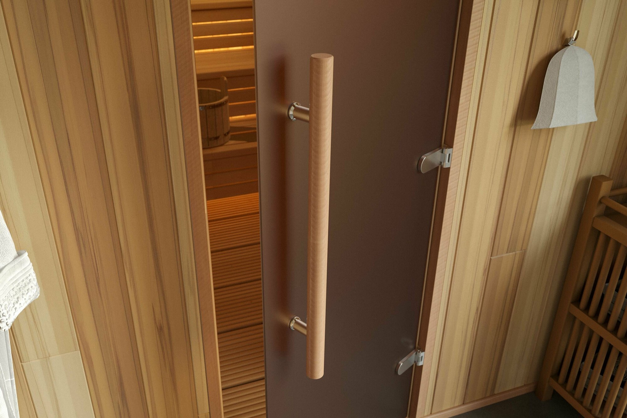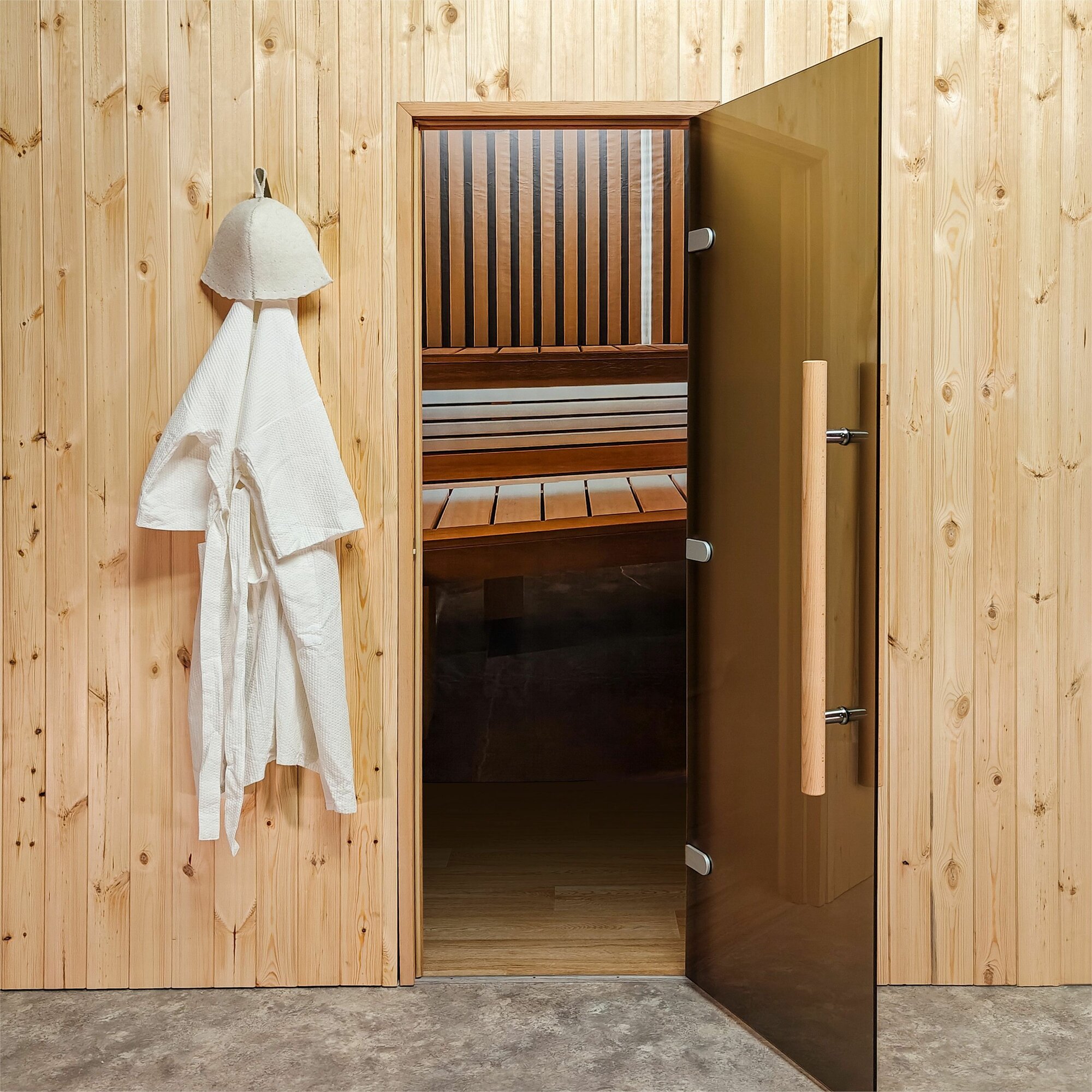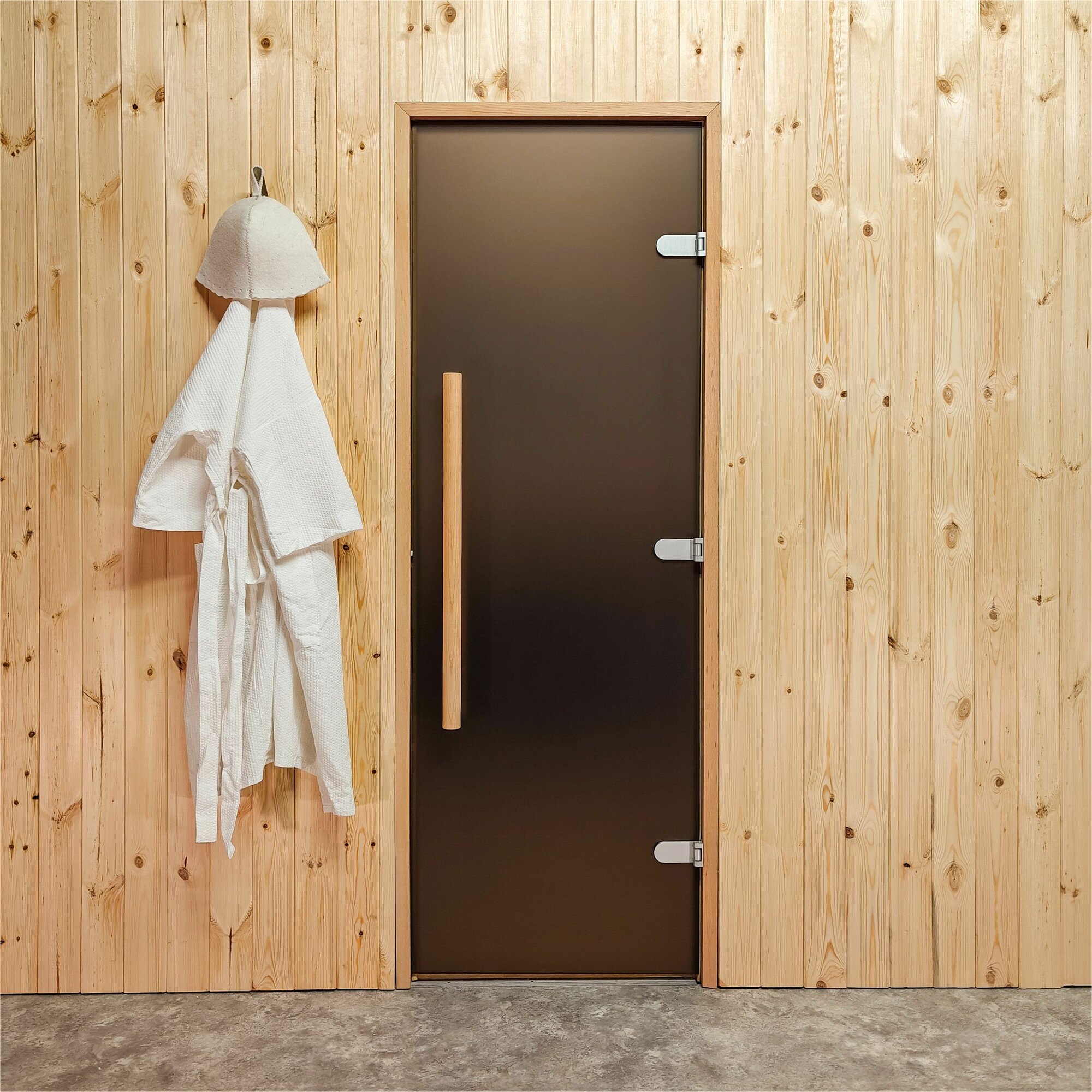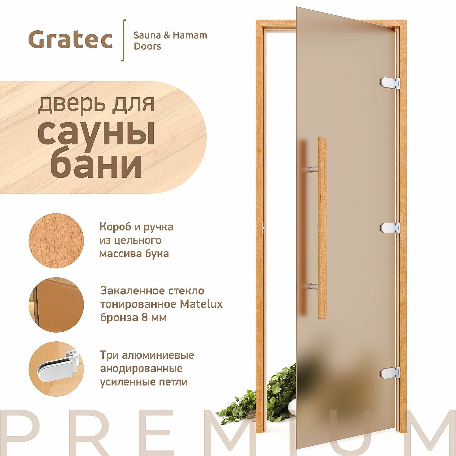 Дверь для бани и сауны Gratec Teia Premium 2025, короб из массива бука, бронза матовое закаленное стекло 8 мм, правое открывание интересное: