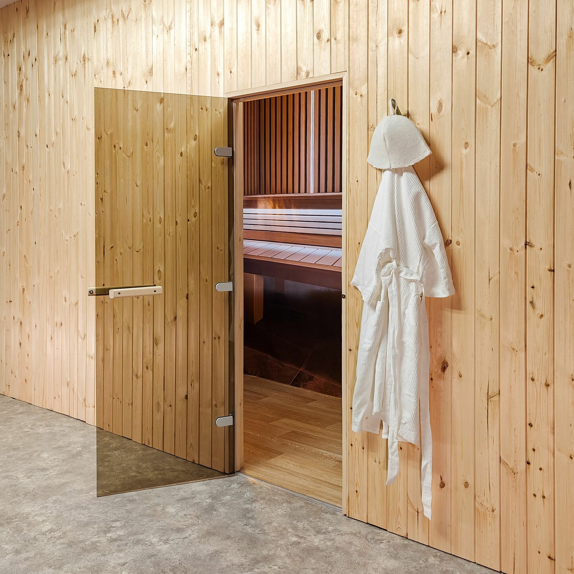 Дверь для бани и сауны Gratec Kati, короб из массива липы, закаленное стекло 8 мм бронза, левое открывание интересное: