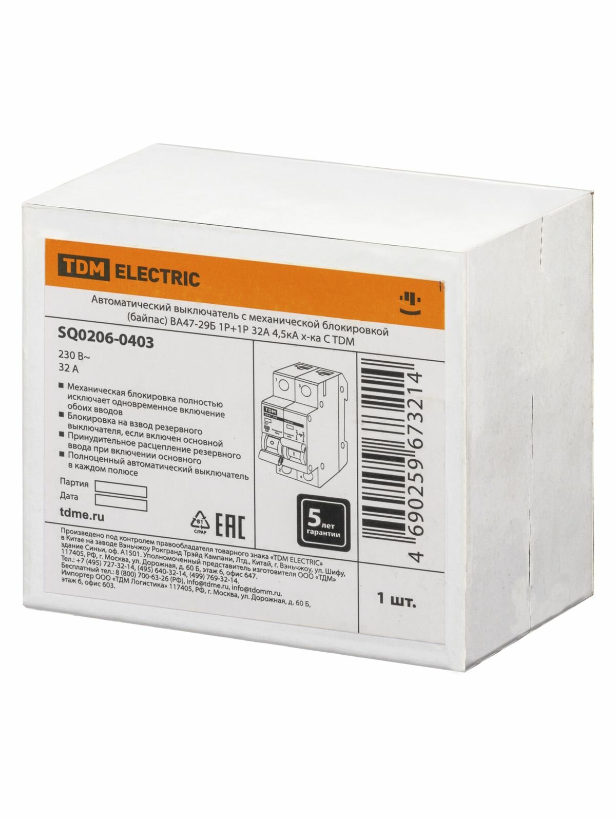 Купить Автоматический выключатель с мех. блок. (байпас) ВА47-29Б 1Р+1Р 32А 4,5 кА тип C TDM Electric