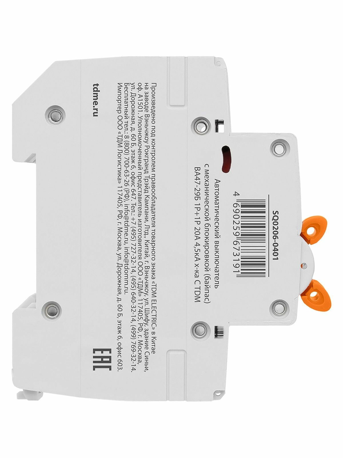 Купить Автоматический выключатель с мех. блок. (байпас) ВА47-29Б 1Р+1Р 20А 4,5 кА тип C TDM Electric