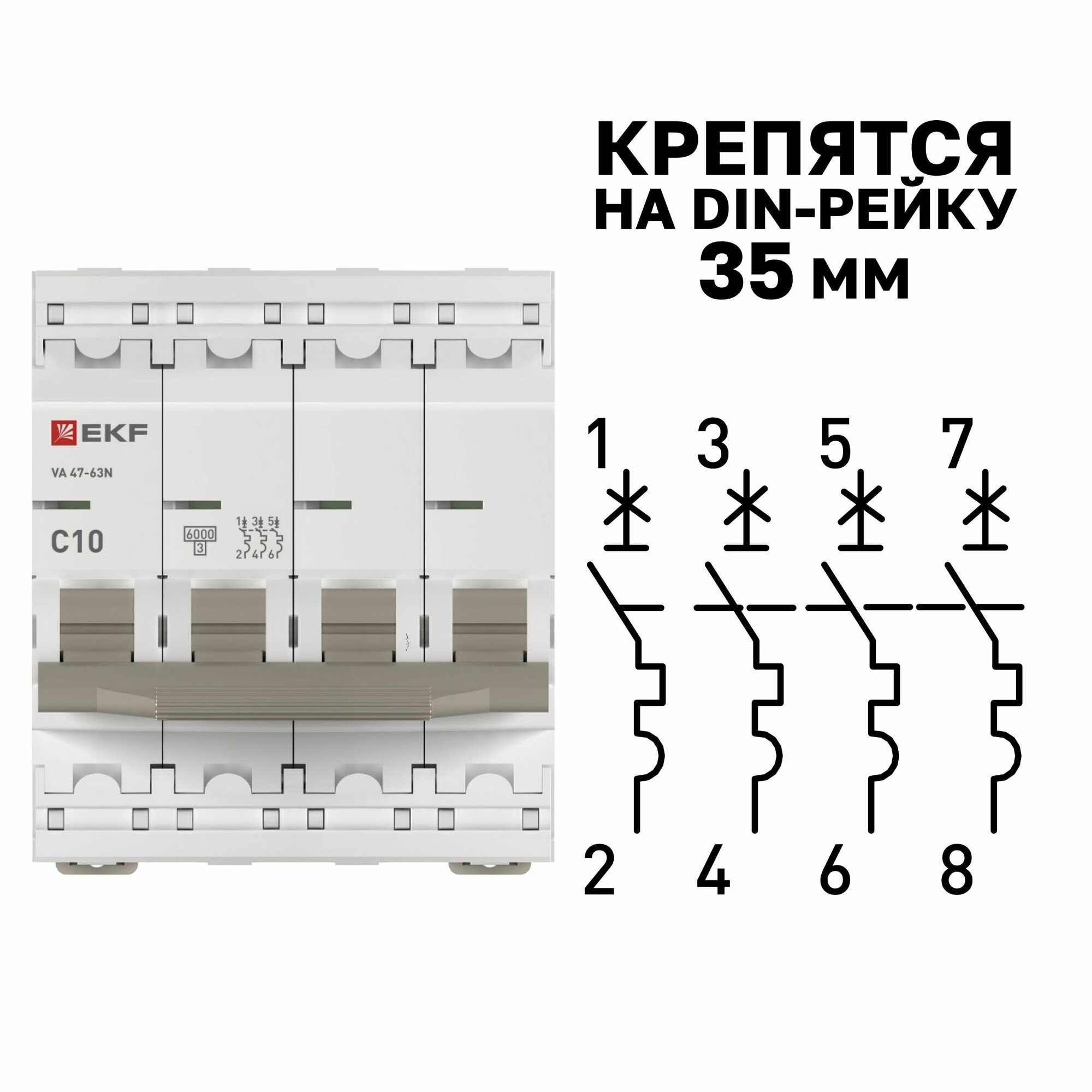 Купить Автомат 10А, тип C, четырехполючный 4P, 6кА, cо встроенной опломбировкой клемм EKF PROxima ВА 47-63N (Автоматический выключатель C10)