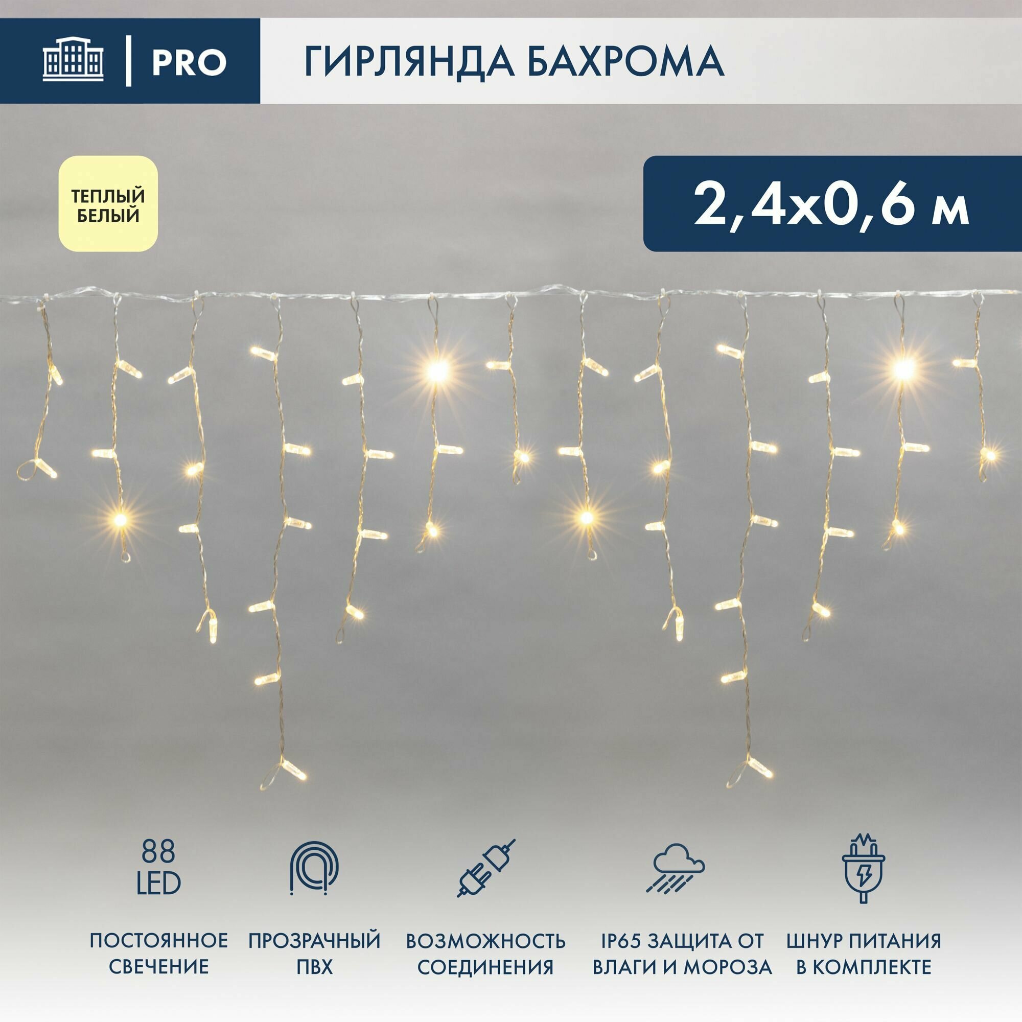 NEON-NIGHT Гирлянда Айсикл (бахрома) светодиодный, 2,4 х 0,6 м, белый провод, 230 В, диоды теплый белый, 88 LED NEON-NIGHT