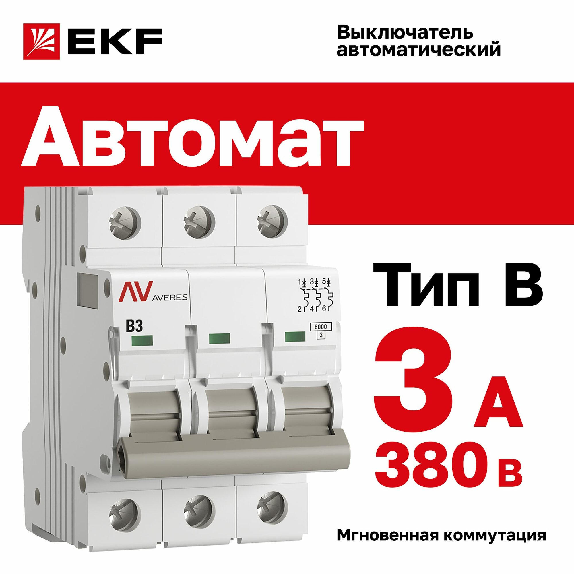 Купить Автомат 3A, тип B, трёхполюсный 3P, 6kA, EKF AVERES (Автоматический выключатель B3)