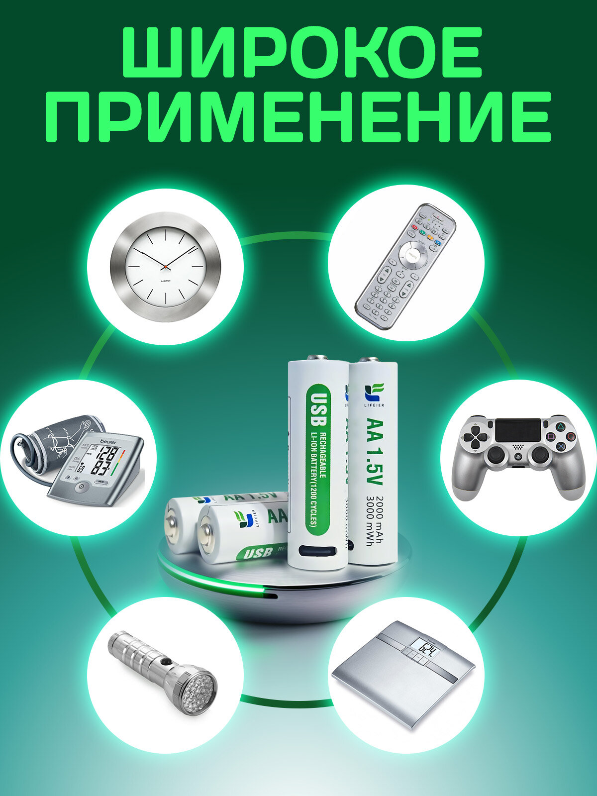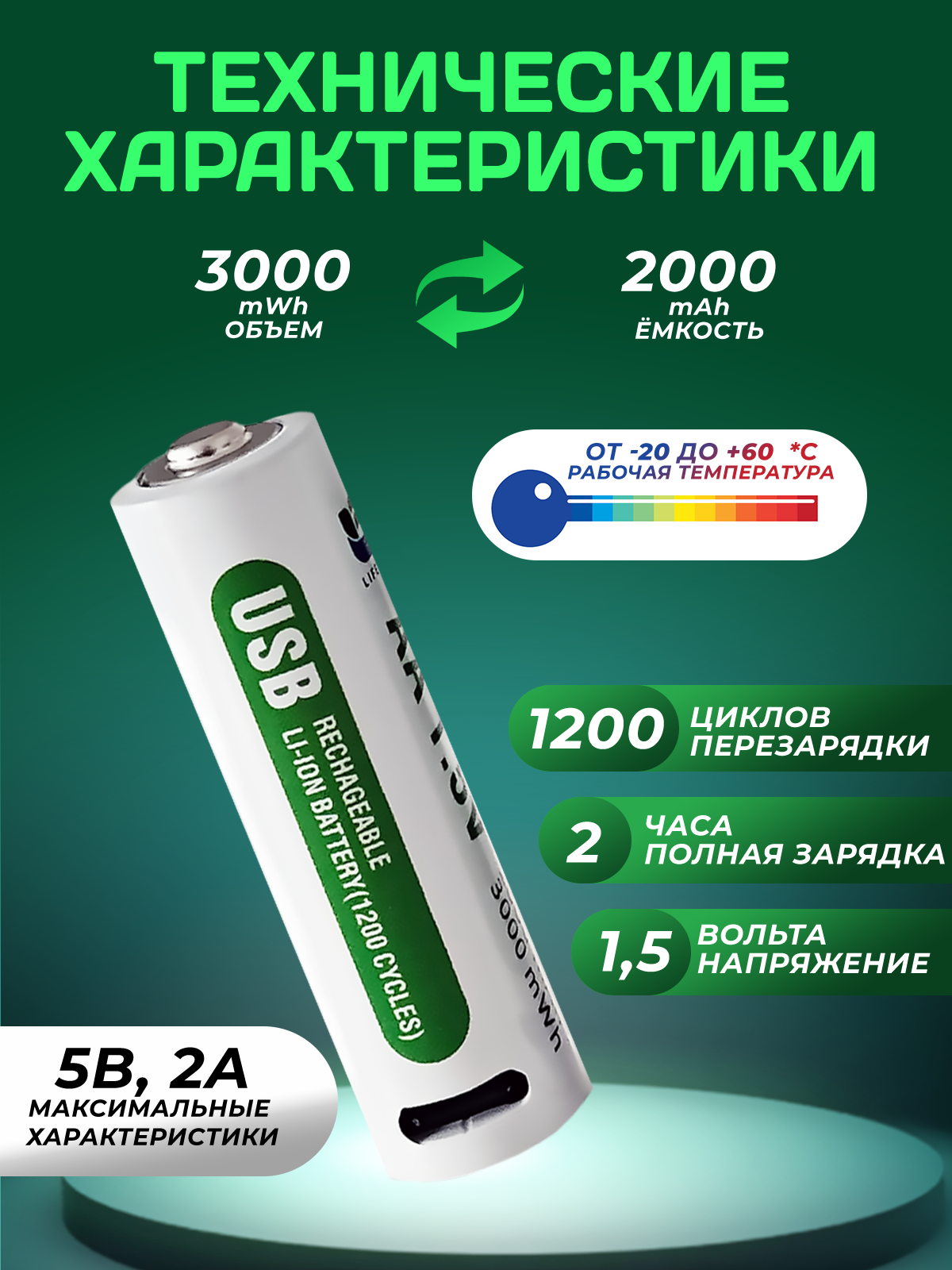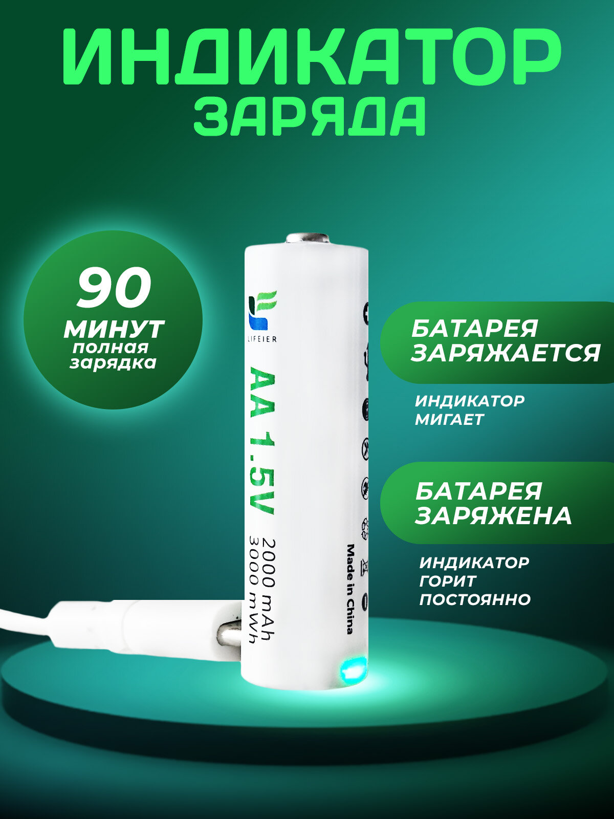 Аккумуляторные батарейки, AA, Li-Ion, 3000 mWh, с кабелем USB, 4шт интересное:
