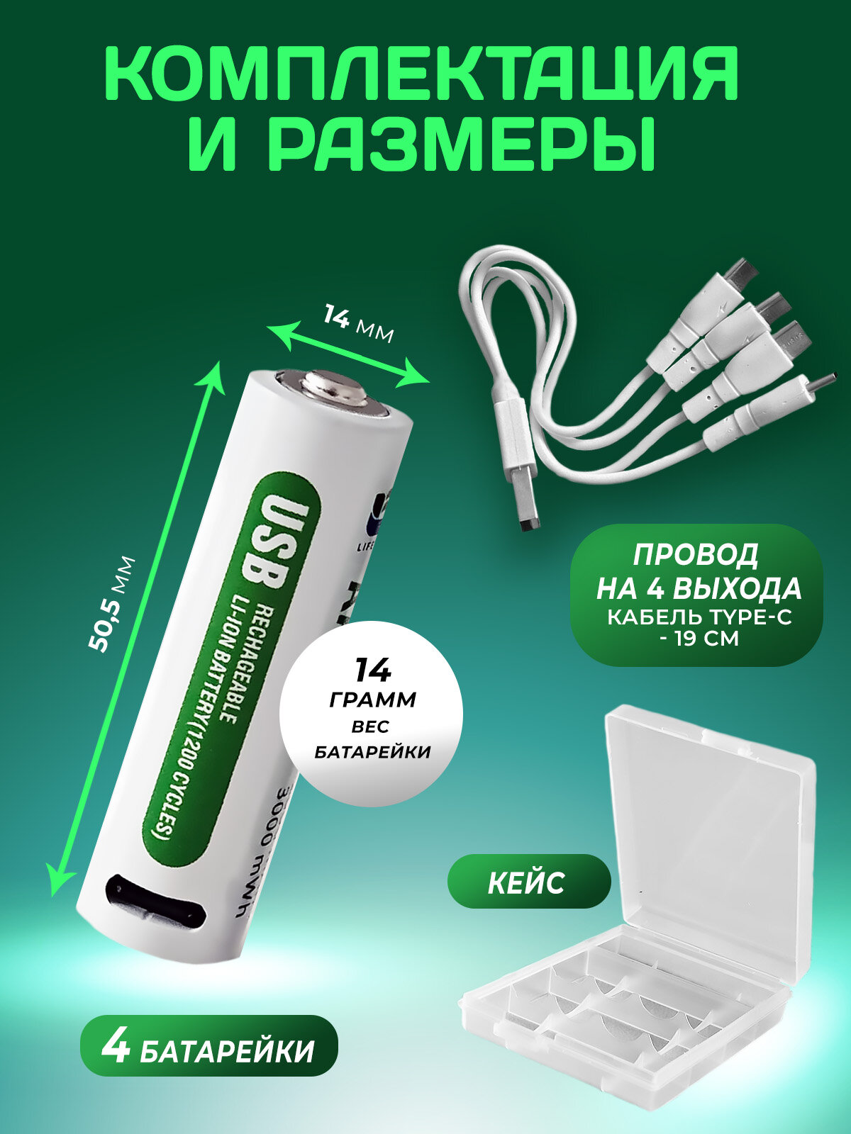 Аккумуляторные батарейки, AA, Li-Ion, 3000 mWh, с кабелем USB, 4шт