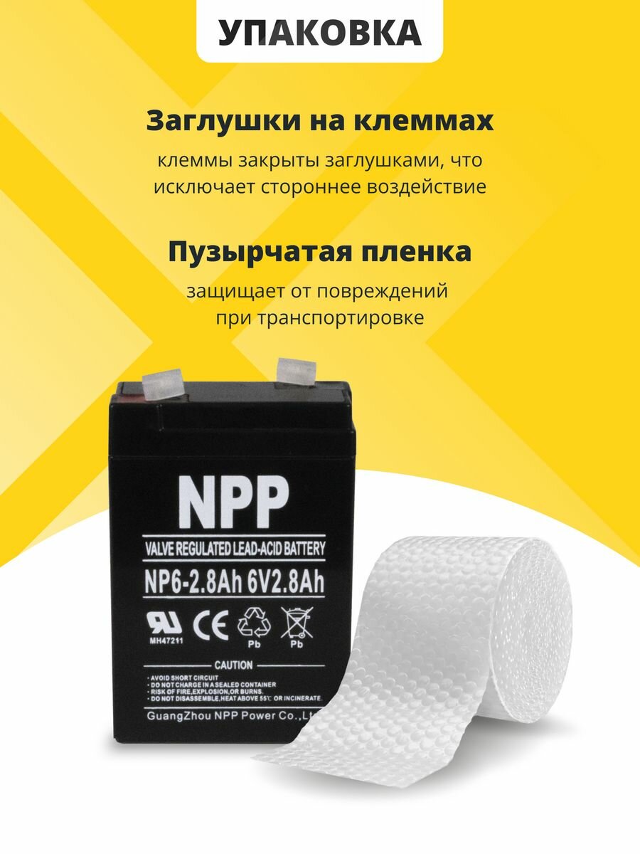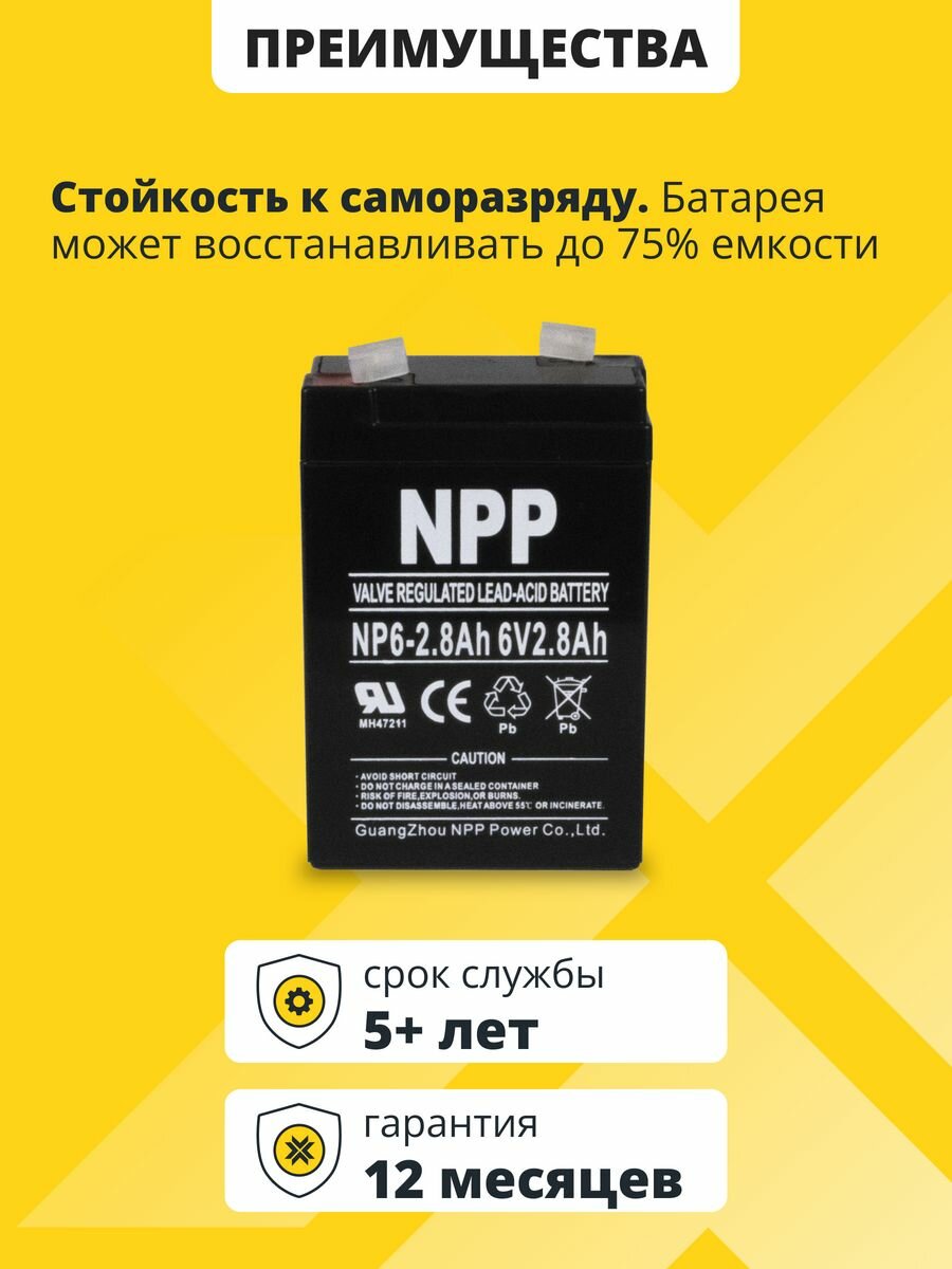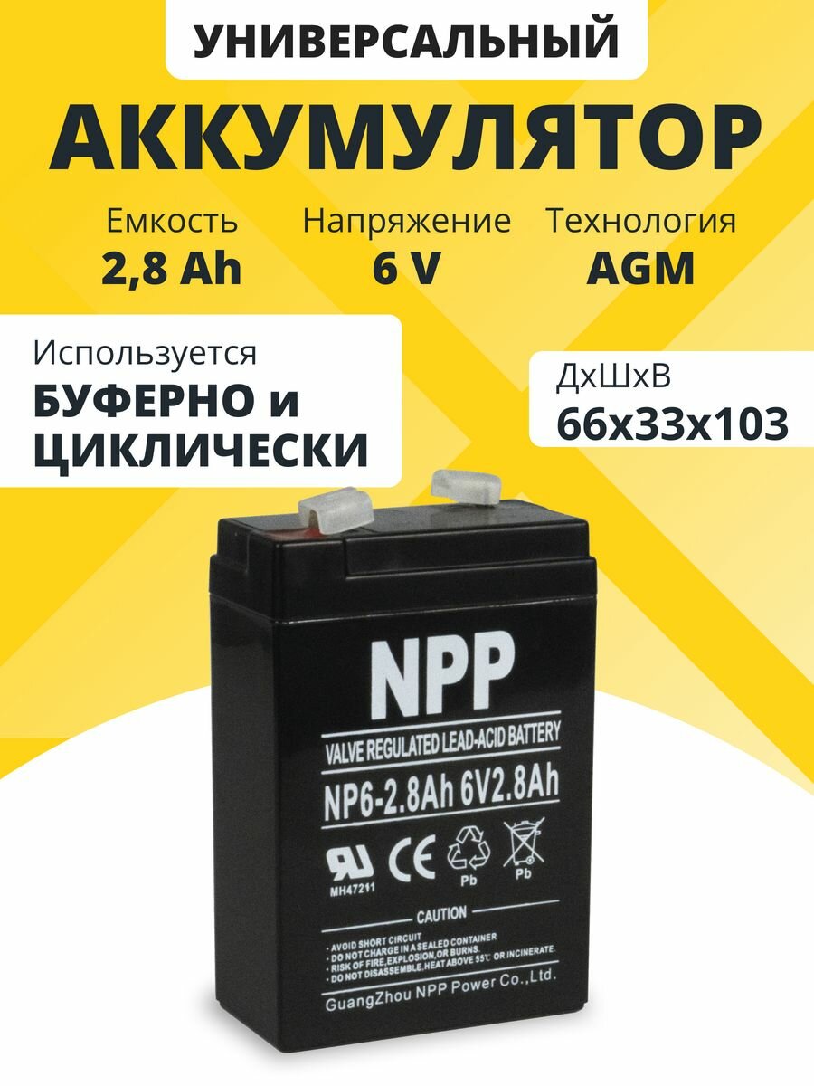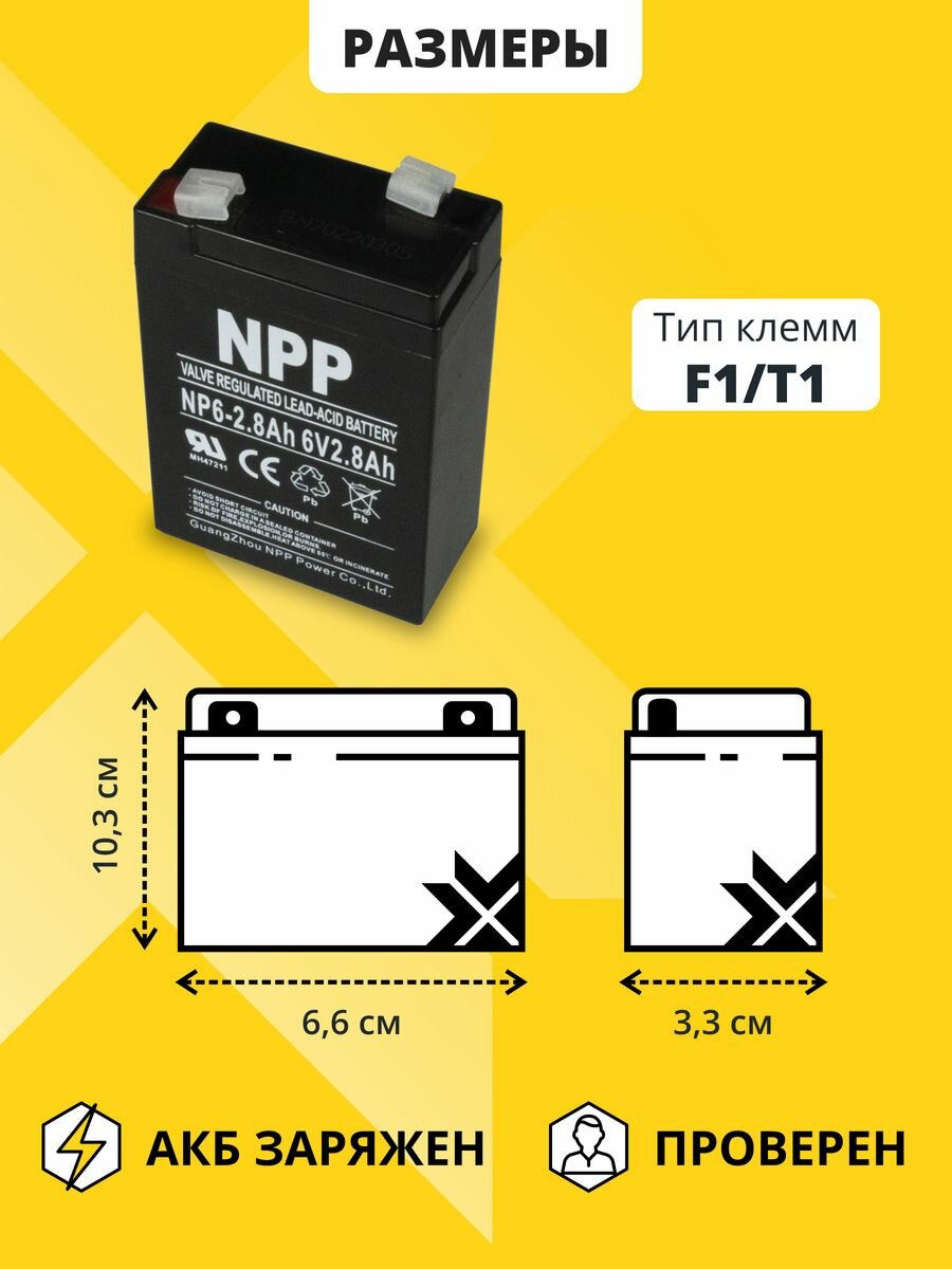 Купить Аккумулятор 6v 2,8 Ah NPP AGM F1/T1 акб для кассы, фонаря, весов 66x33x103 мм