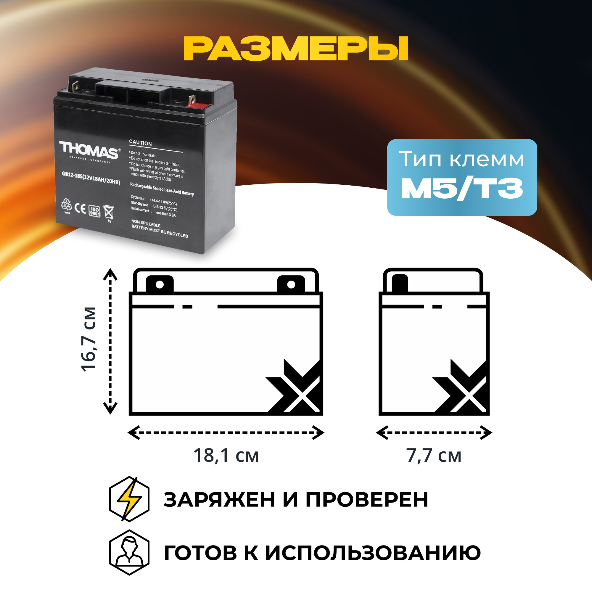 СохранитьАккумулятор 12v 18 Ah THOMAS AGM M5/T3 акб для охранных пожарных систем 181x77x167 мм интересное: