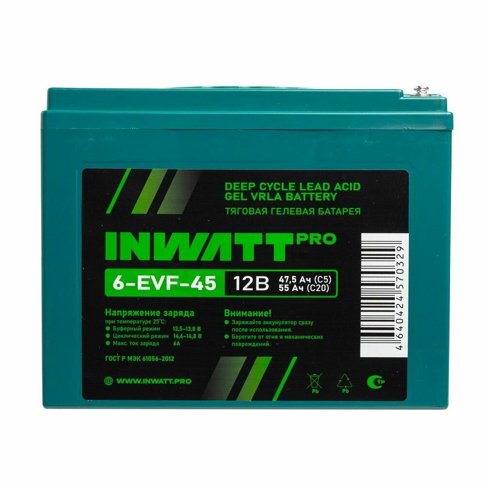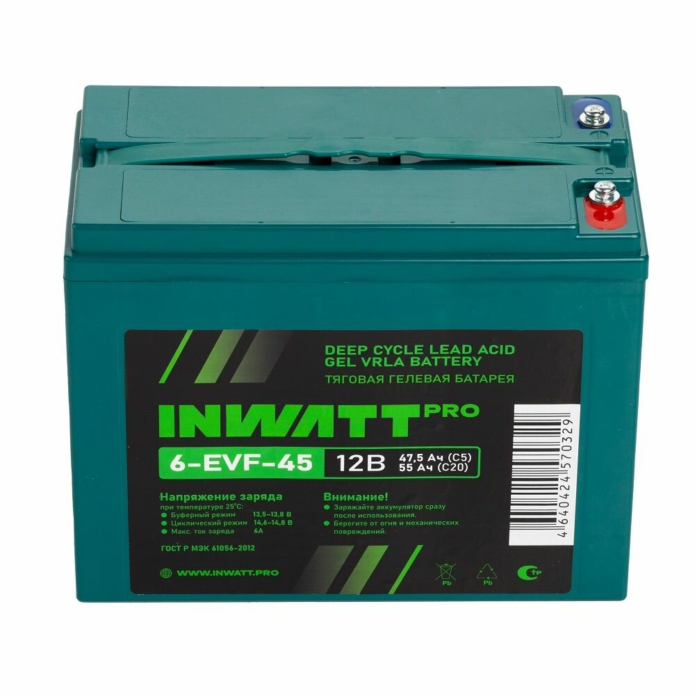 Купить Тяговый аккумулятор INWATT Pro 6-EVF-45 12В 55Ач (12V 55Ah) AGM для ИБП UPS поломоечной машины, штабелера, подъемника, электропогрузчика, тележки, транспортера, гольфкара