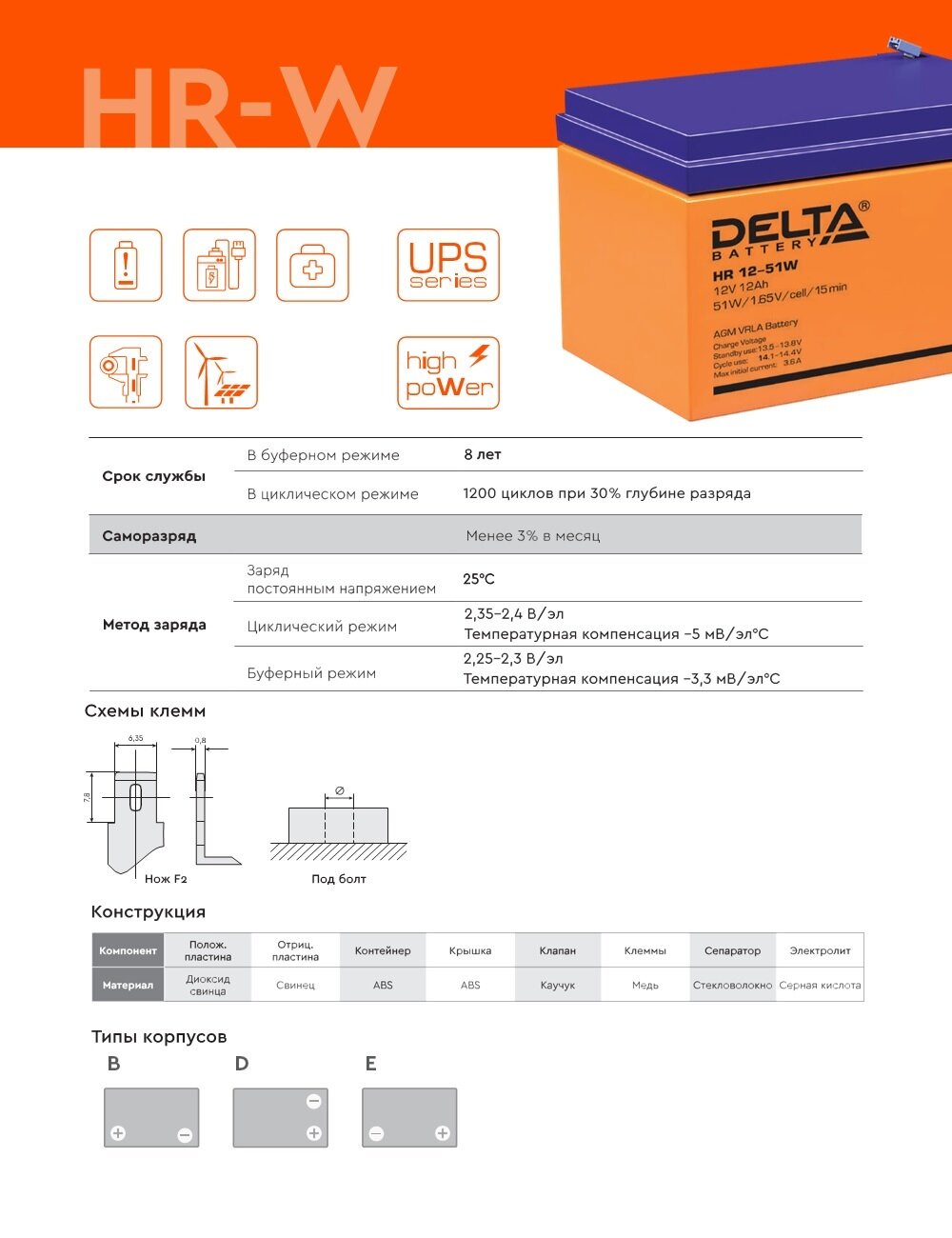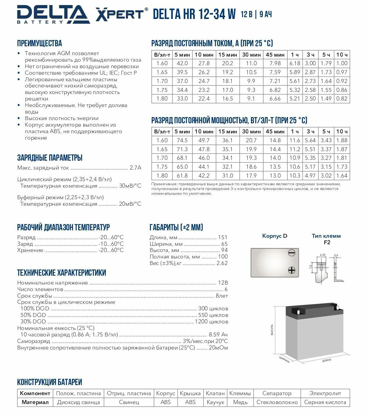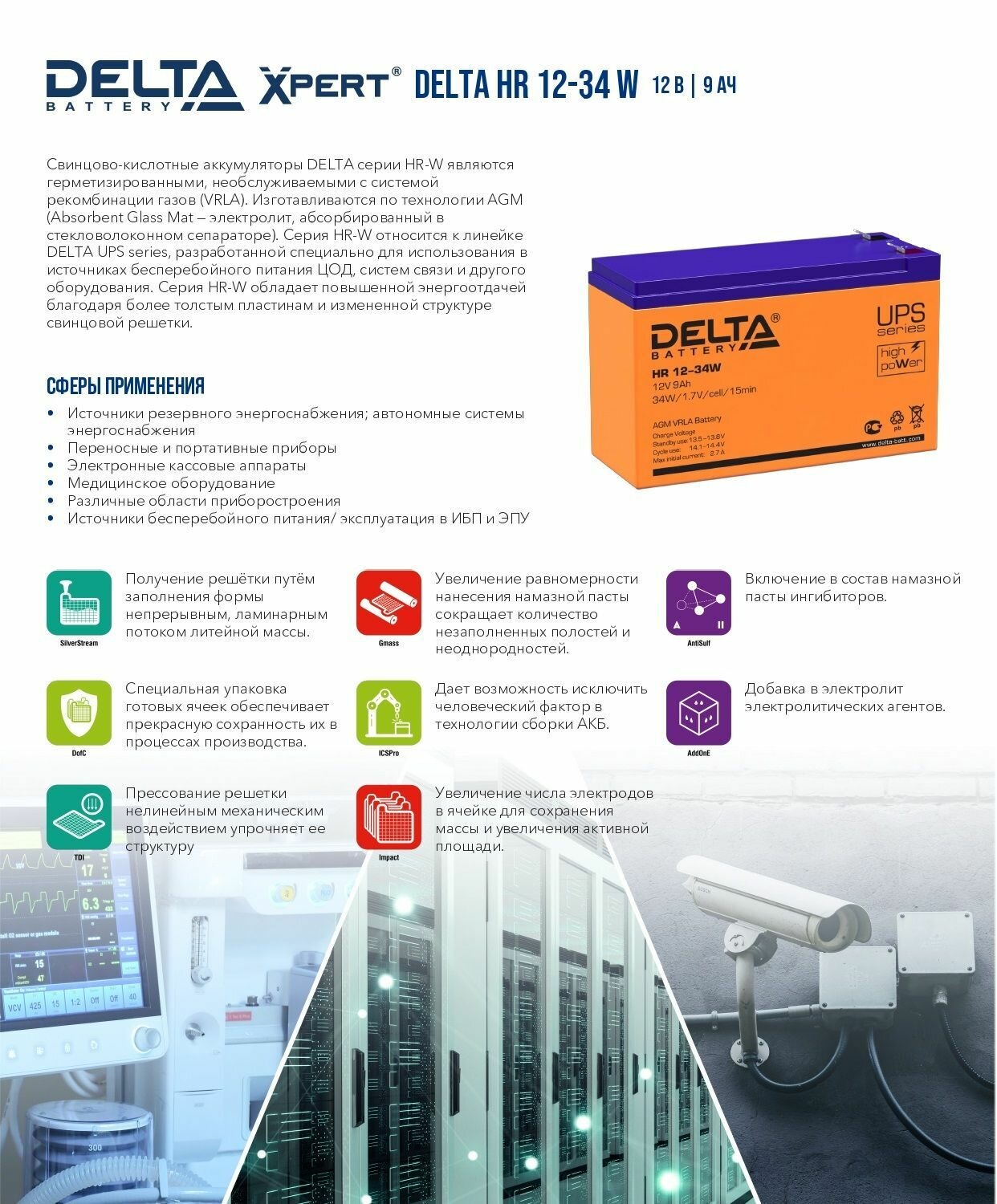 Аккумулятор Delta HR 12-34W 12В 9Ач (12V 9Ah) AGM для аккумулятор ИБП, UPS, детского электромобиля интересное: