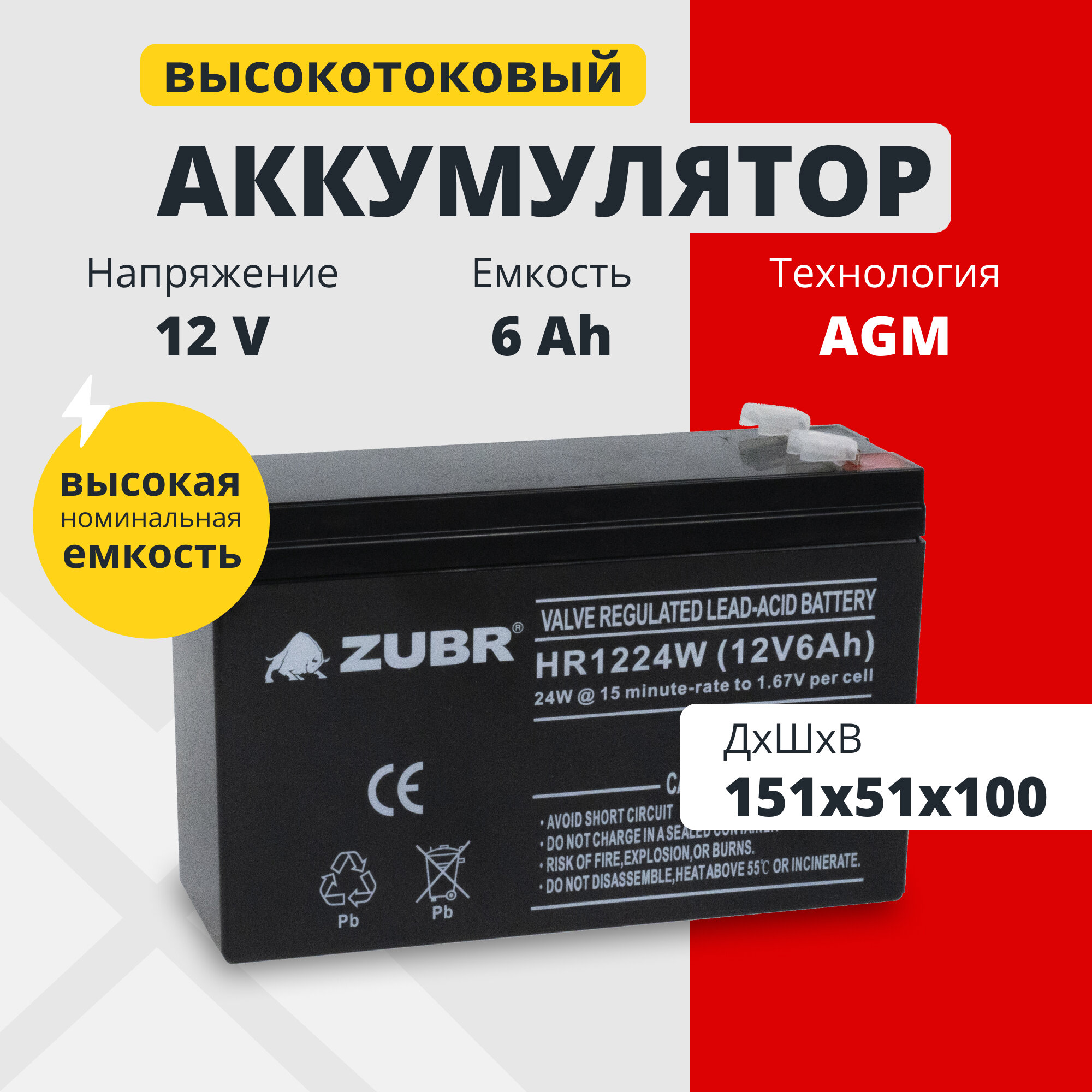 Купить Аккумулятор для ибп 12v 6 Ah ZUBR HR12-24W AGM F2/T2 акб игрушечной машины, весов 151x51x100 мм