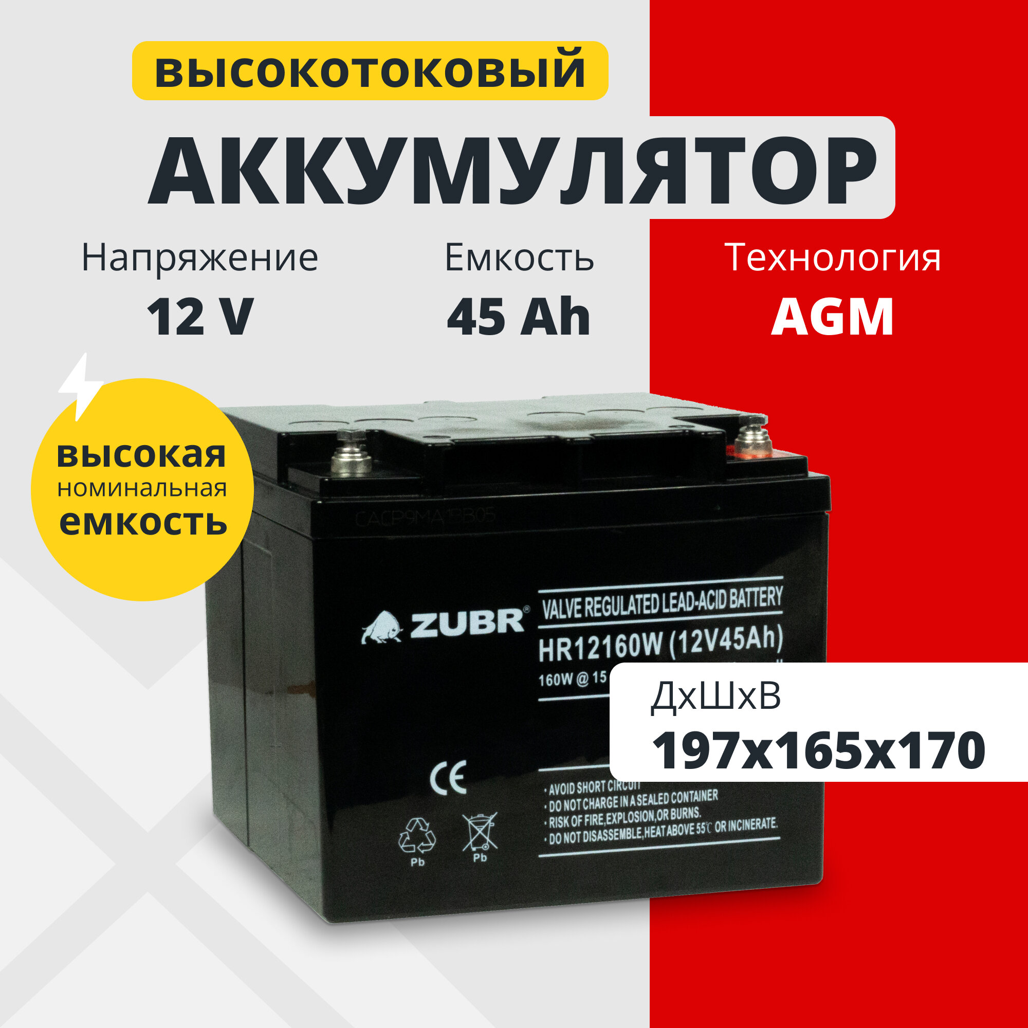 Купить Аккумулятор для ибп 12v 45Ah ZUBR HR12-160W AGM M6/T14 бесперейник на компьютер 197x165x170 мм